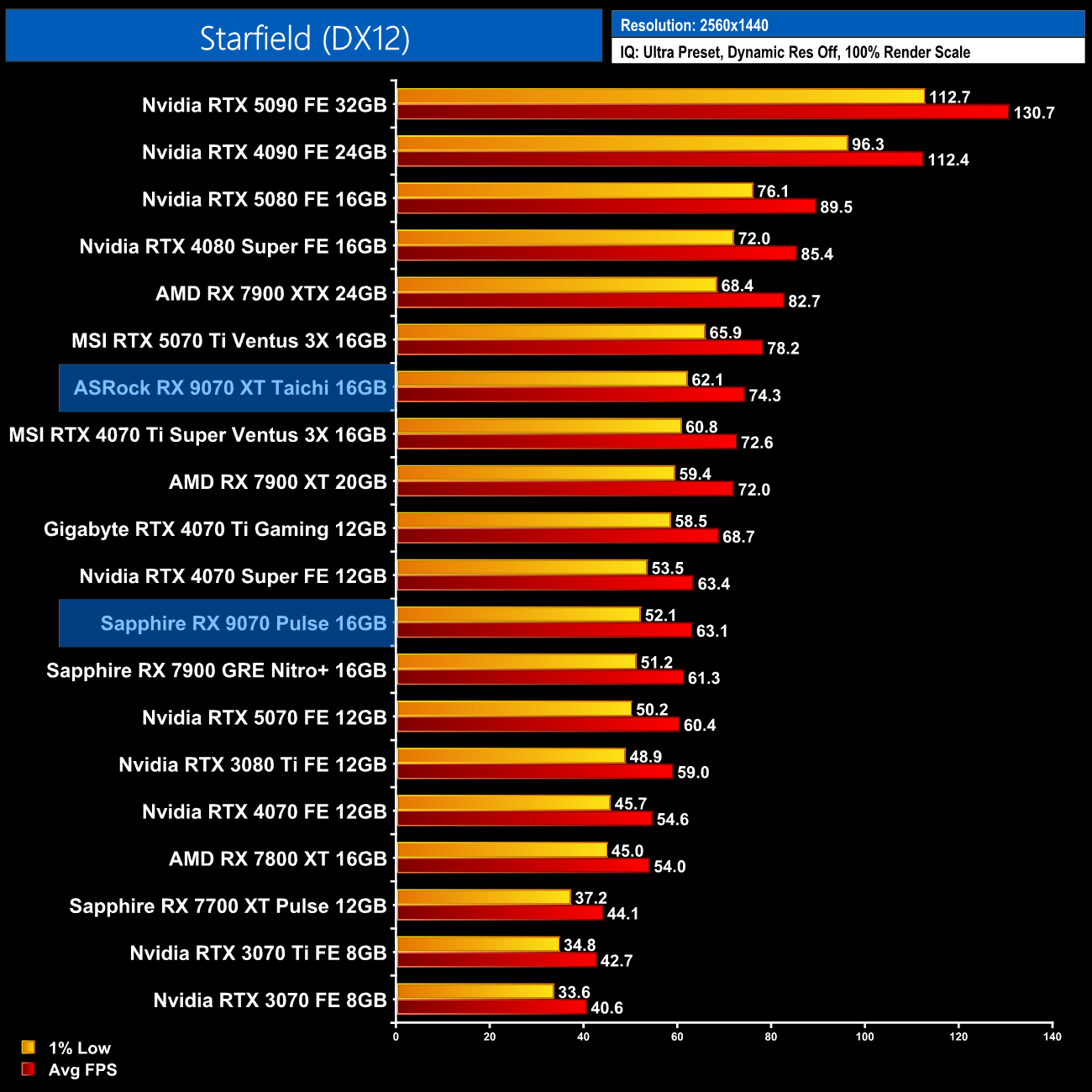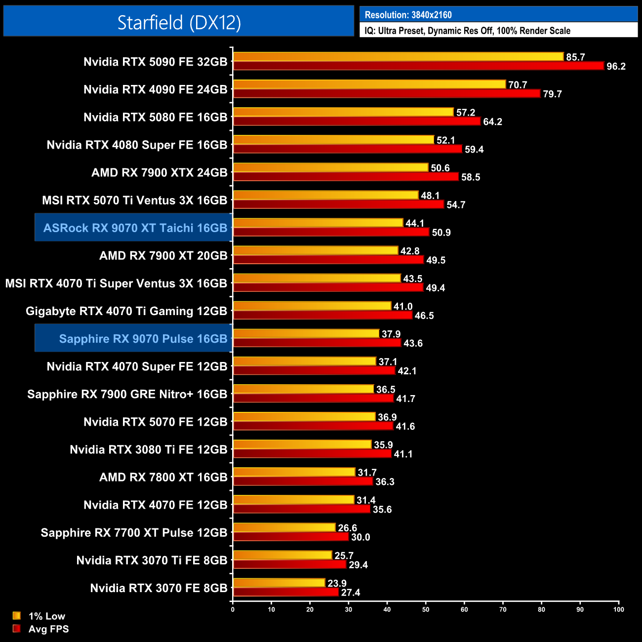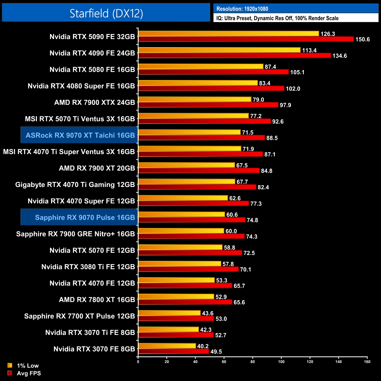 Oddly, despite being an AMD-sponsored title, RDNA 4 seems to underperform in Starfield. We see just a 3% gain for the 9070 XT over the 7900 XT, making it 5% slower than the 5070 Ti. It's still solid, but not as impressive as the other games we've tested.