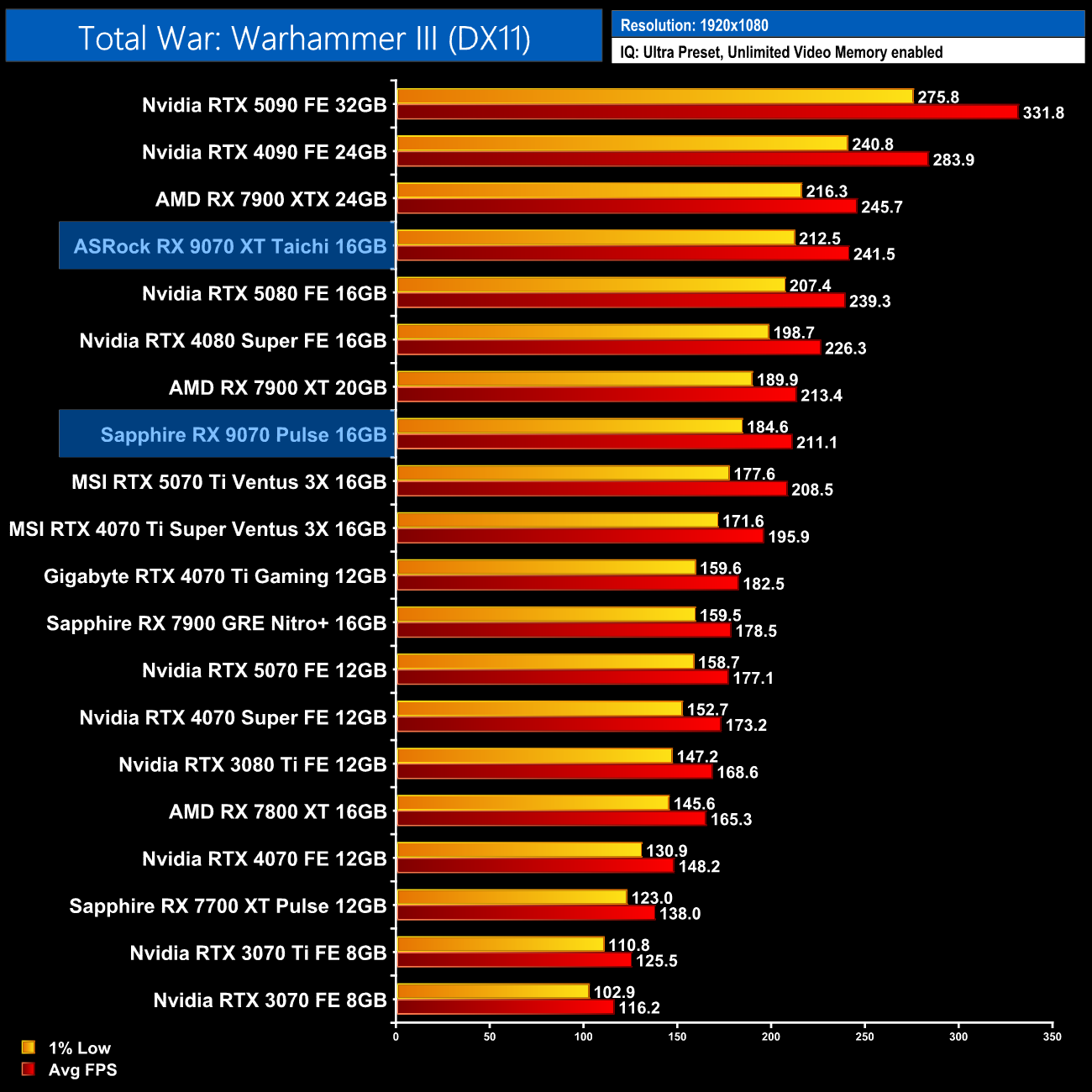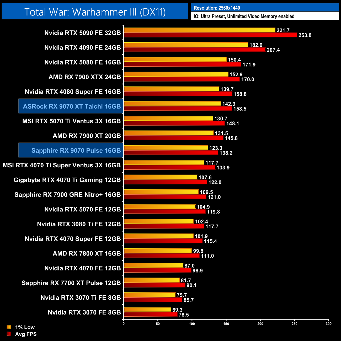 Our last rasterised game of the day is Total War: Warhammer III, where at 1440p the 9070 XT looks like great value, equalling the 4080 Super at just under 160fps on average.