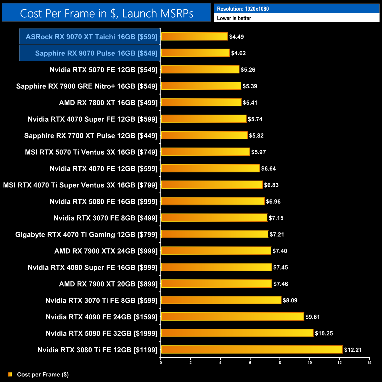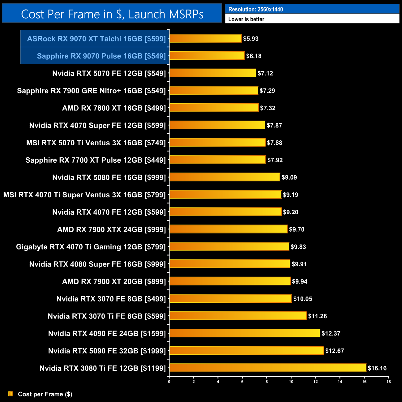 At the time of writing we only have confirmed US pricing – any calculations using GBP will have to wait, unfortunately. Still, the overall trend is clear – comparing MSRPs, the RDNA 4 GPUs are the new market leaders for rasterisation value. At 1440p, for instance, cost per frame is 17% lower than the RTX 5070, and 25% better than the 5070 Ti.