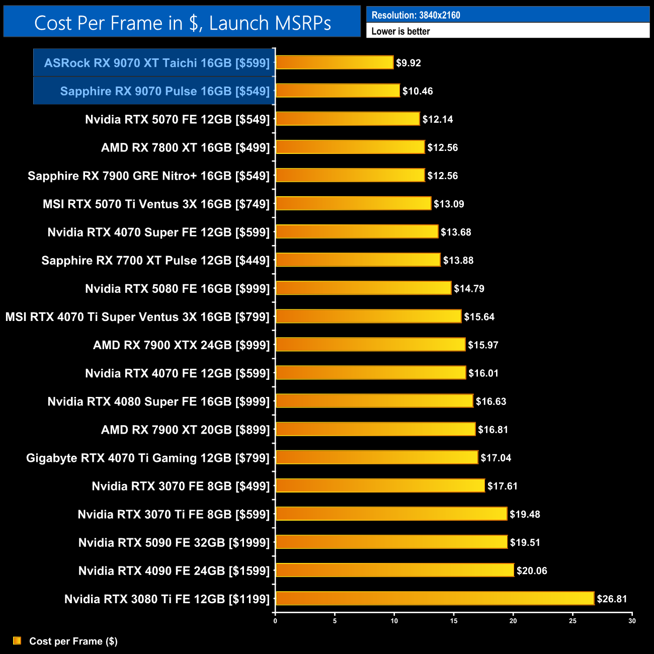 You'll also note that the $599 9070 XT is better value than the $549 9070, given it works out at 14% faster for just 9% more money – a questionable decision from AMD to put it mildly.