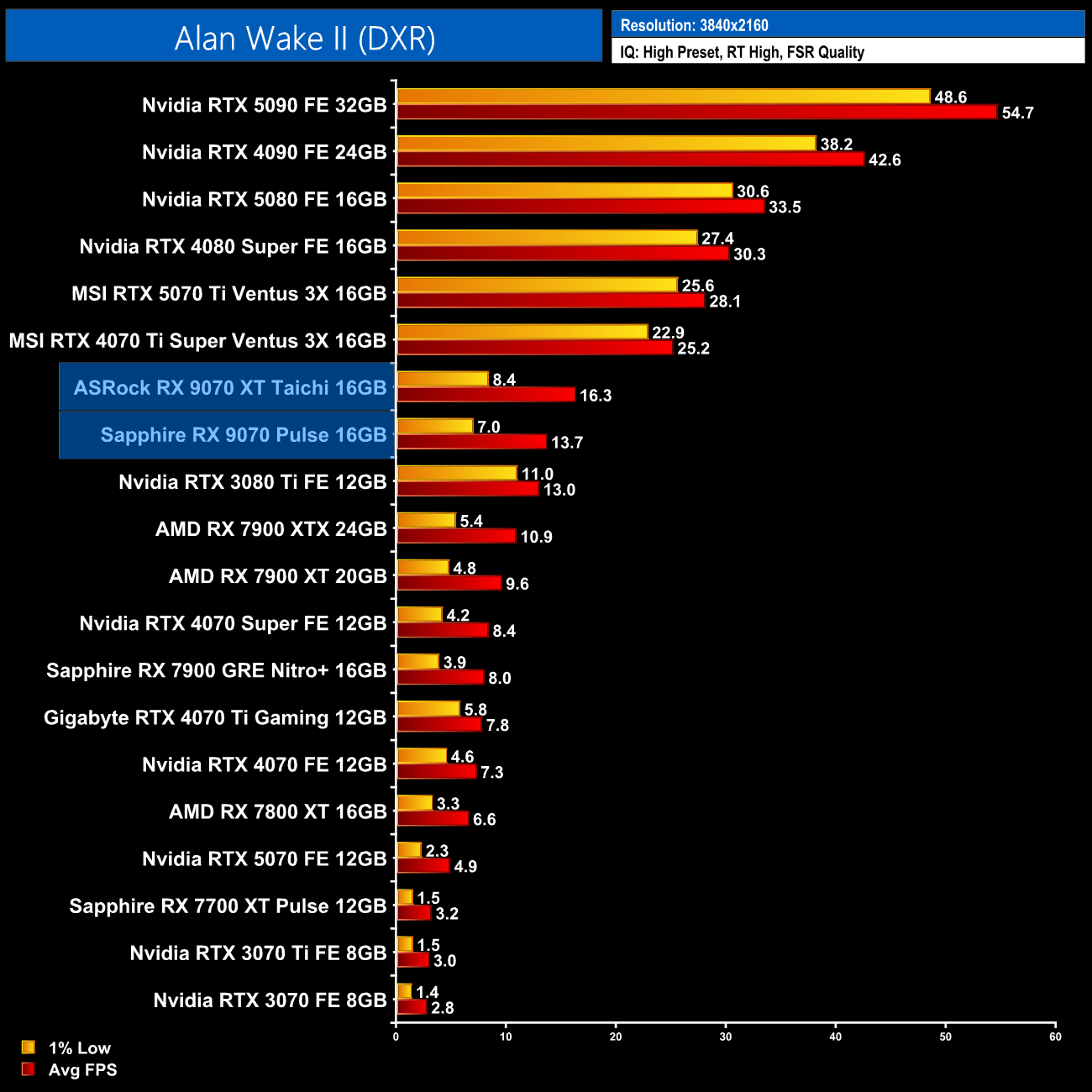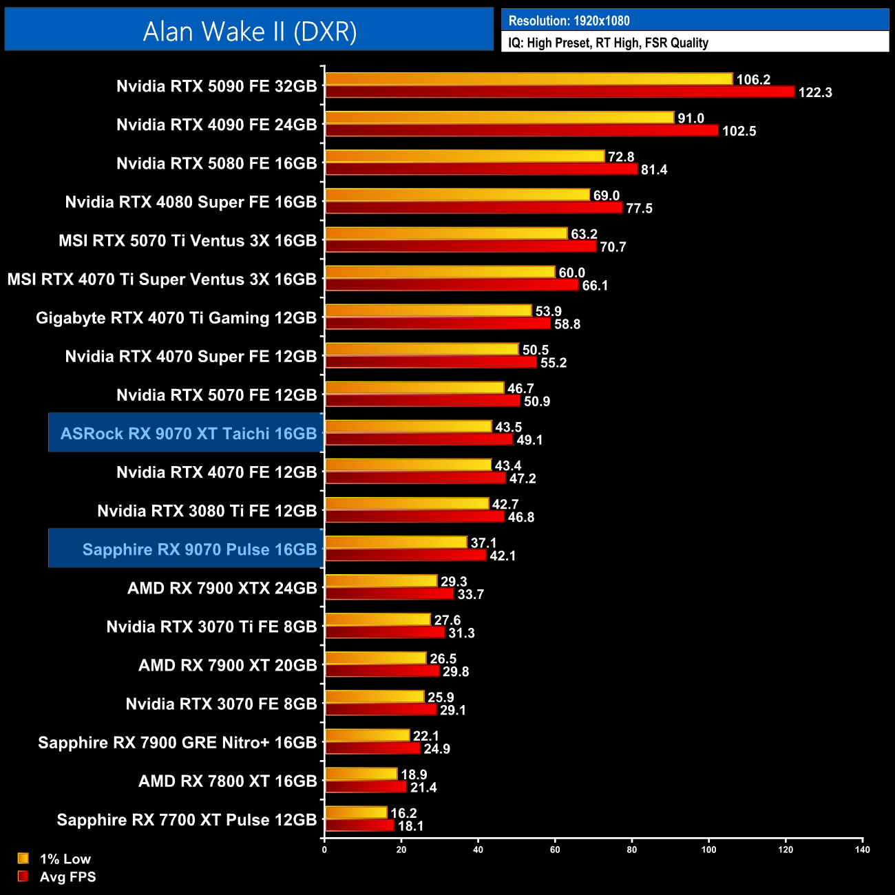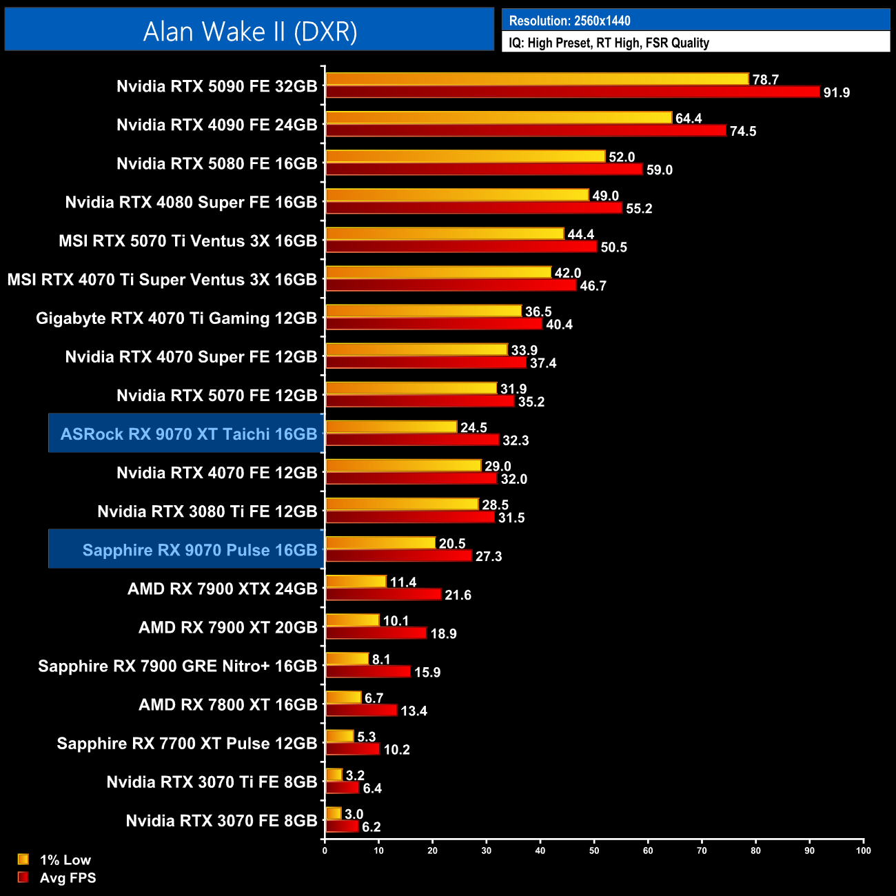 We've seen raster performance – but what about ray tracing? We start with Alan Wake 2, and at 1440p Nvidia is still the clear winner here – the 9070 XT is only on par with the RTX 4070, making it 42% slower than the RTX 5070 Ti. AMD has still made huge strides, given the 9070 XT is 50% faster than the 7900 XTX, but it's not enough to get close to the GeForce competition.