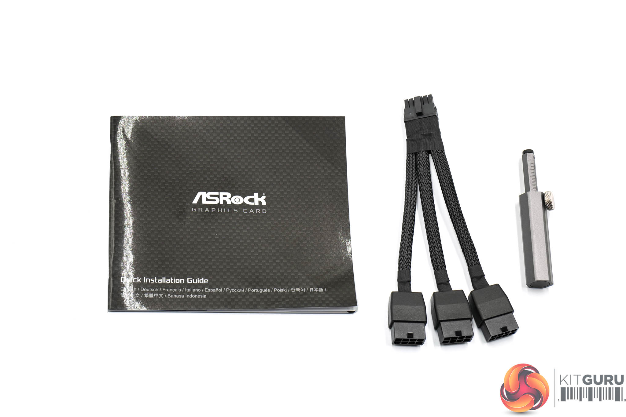 Inside, we find a quick start guide, triple 8-pin power adapter, alongside a small GPU support accessory.