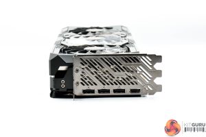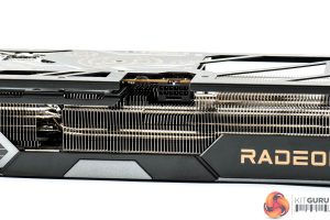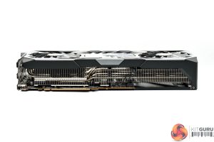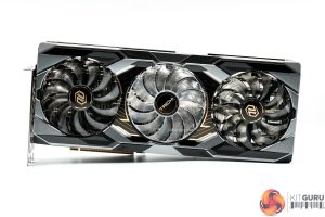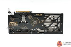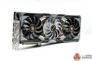 The card itself is rather eye[catching with its design – it may not be for everyone, but the combination of the black and grey shroud, along with the gold accents, makes for something a bit different to what we usually see! ASRock has deployed a triple-fan cooler too, with each fan measuring 100mm in diameter. You will also notice that the central fan spins in reverse, relative to the outer two, which, according to ASRock, helps to ‘lower turbulence and enhance air dispersion through the heatsink.'