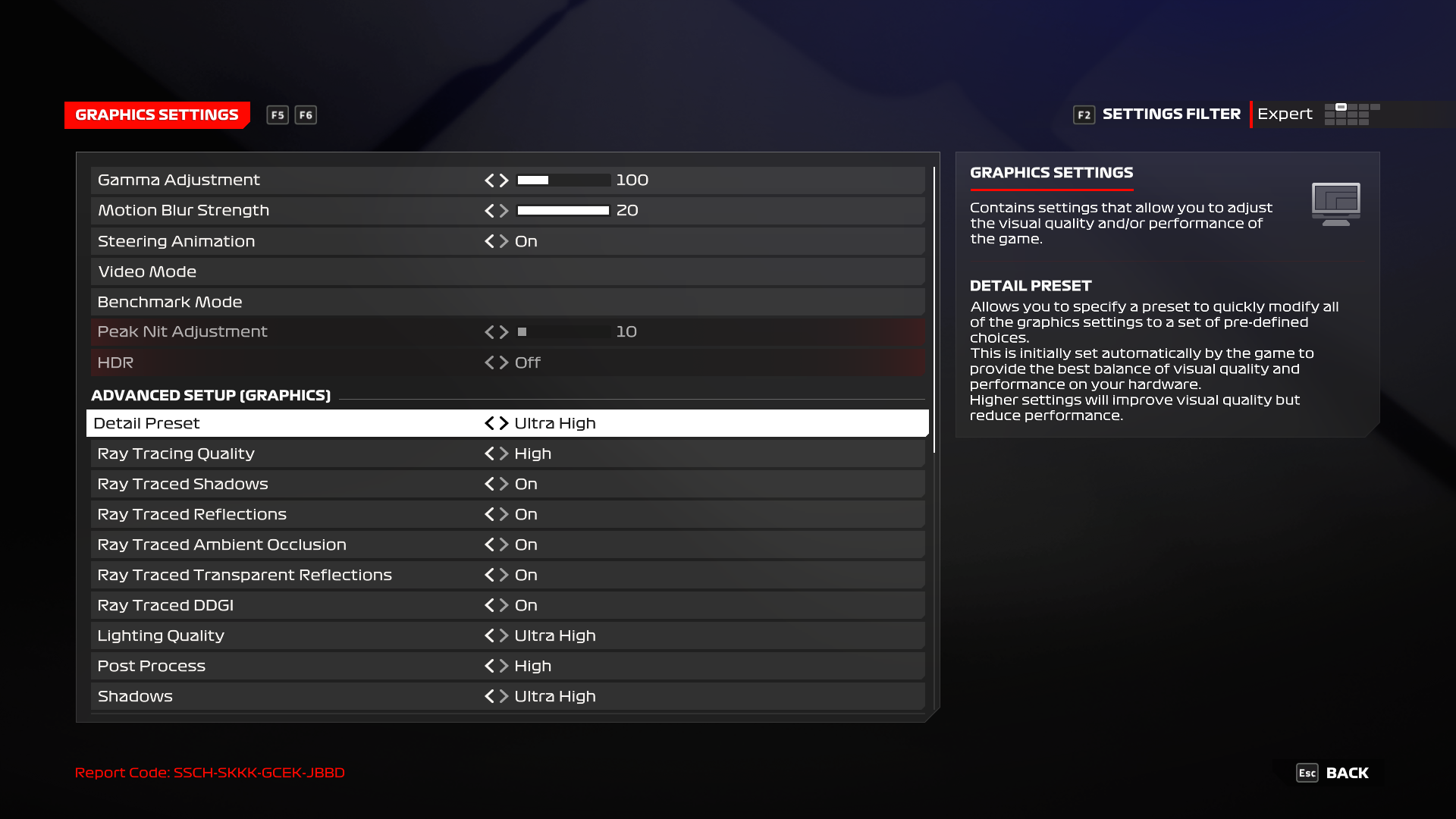 Engine: EGO. We test using the Ultra High preset, High ray tracing quality, DXR API. DLSS/FSR are disabled.