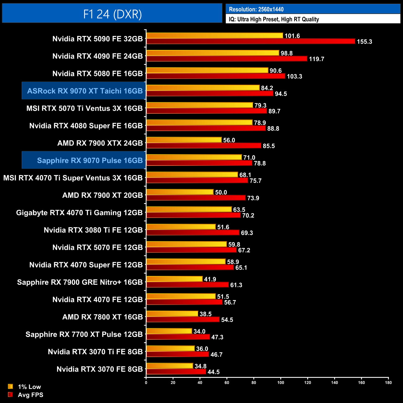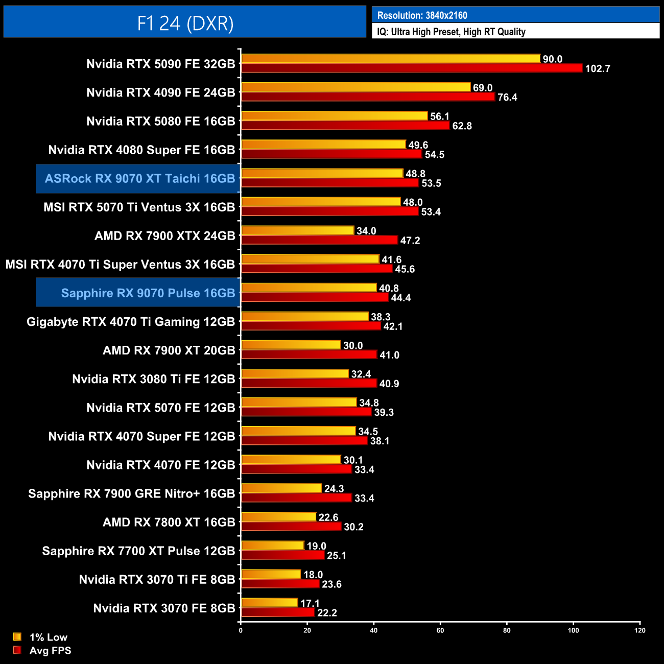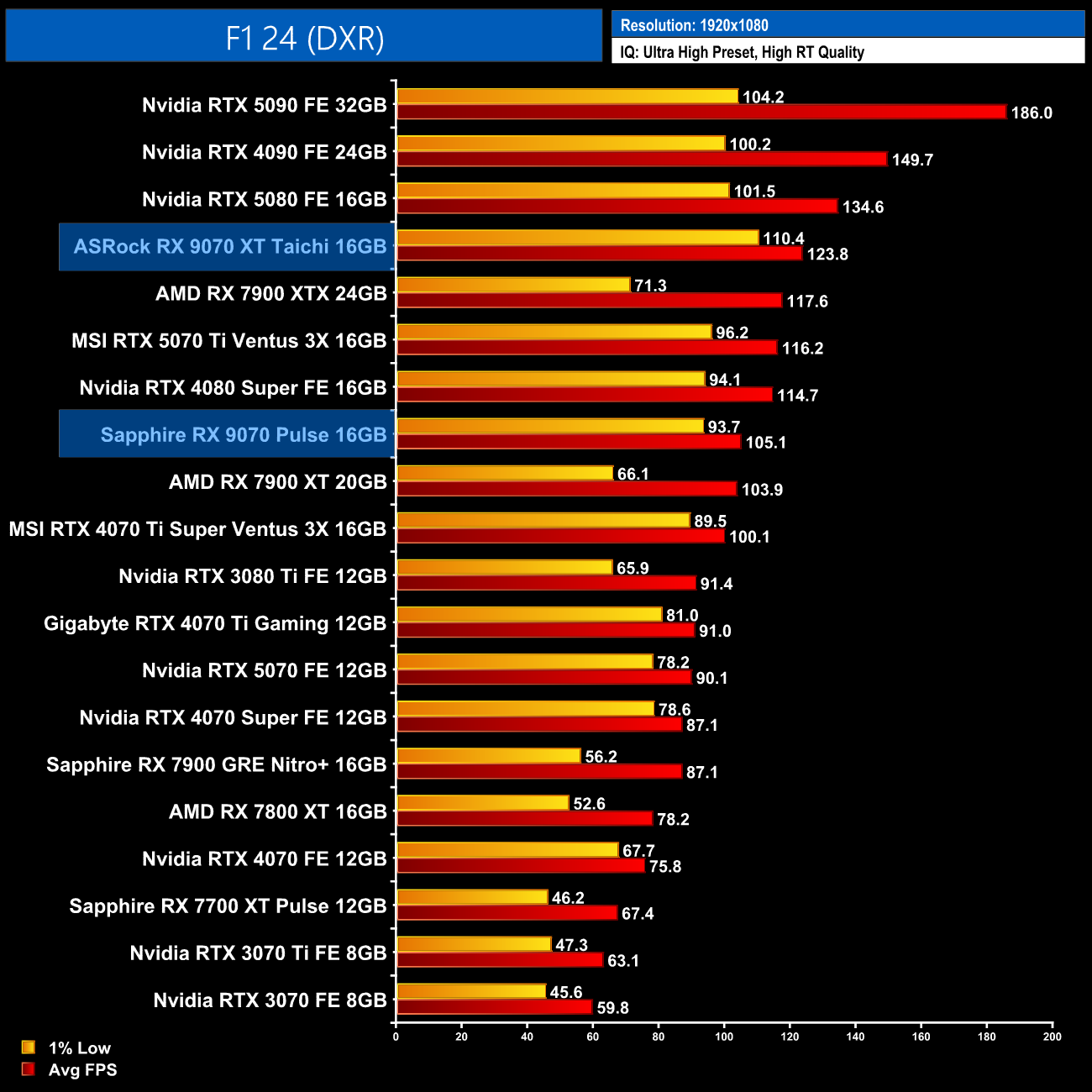 F1 24 even sees the 9070 XT overtake its Nvidia rival! Only by 5%, and this game tends to run better on Radeon GPUs anyway, but it's still a big achievement for AMD. The RDNA 4 GPUs also seem to have cleaned up the 1% lows, which are very poor on RDNA 3, so perhaps re-testing those older cards on the latest driver will sort that out.