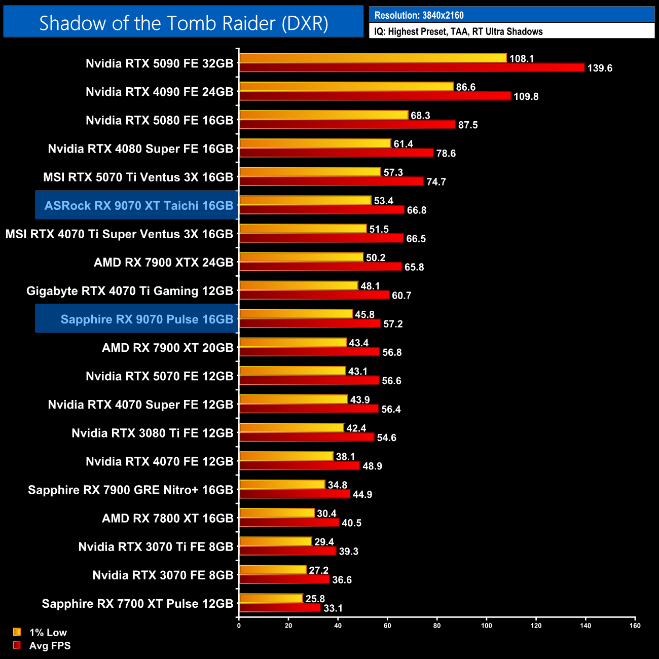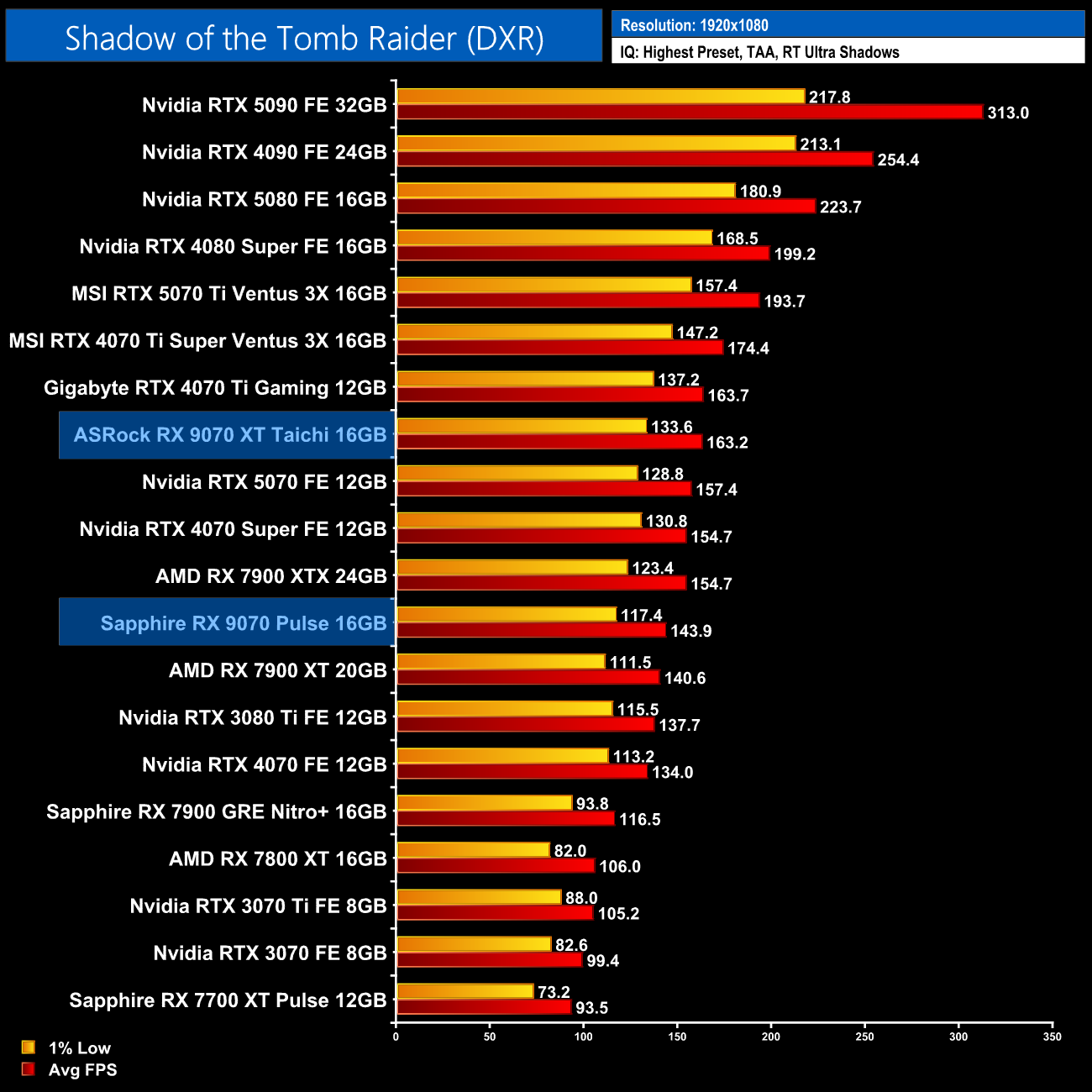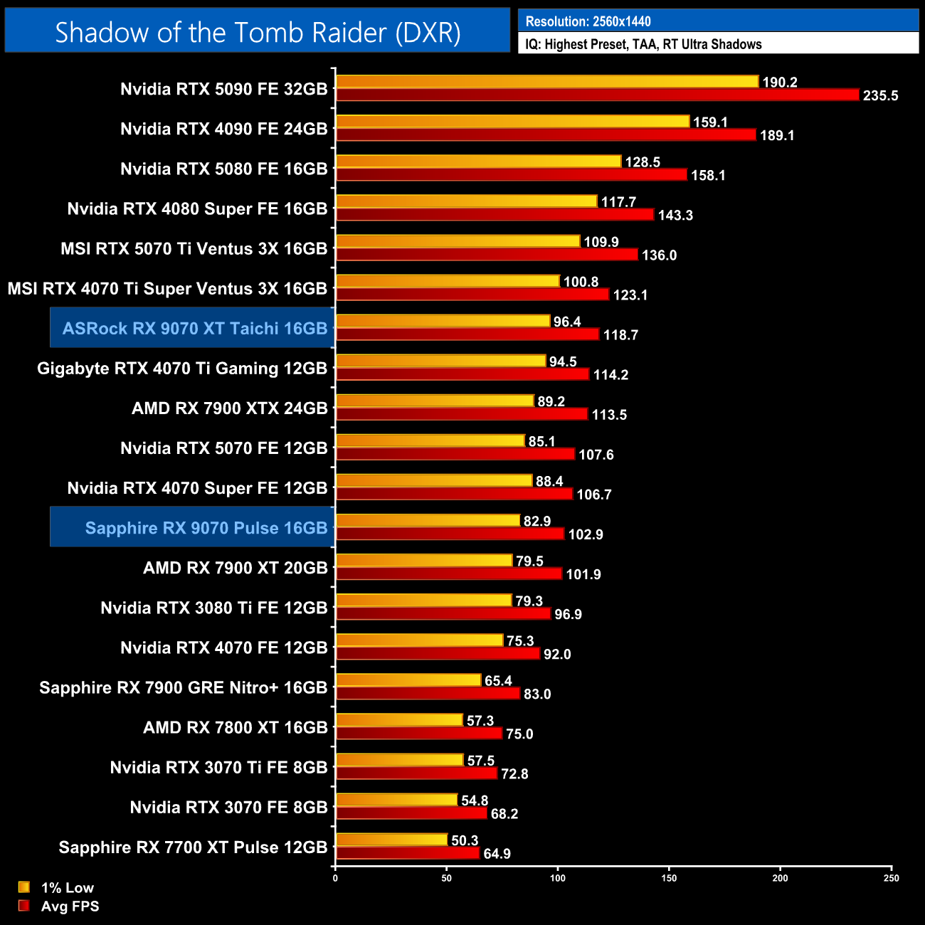 As for Shadow of the Tomb Raider, here the gains over the 7900 XTX are also minor at best, with just a 5% gain on show given this title only utilises ray traced shadows. It's also 13% behind the RTX 5070 Ti at 1440p.
