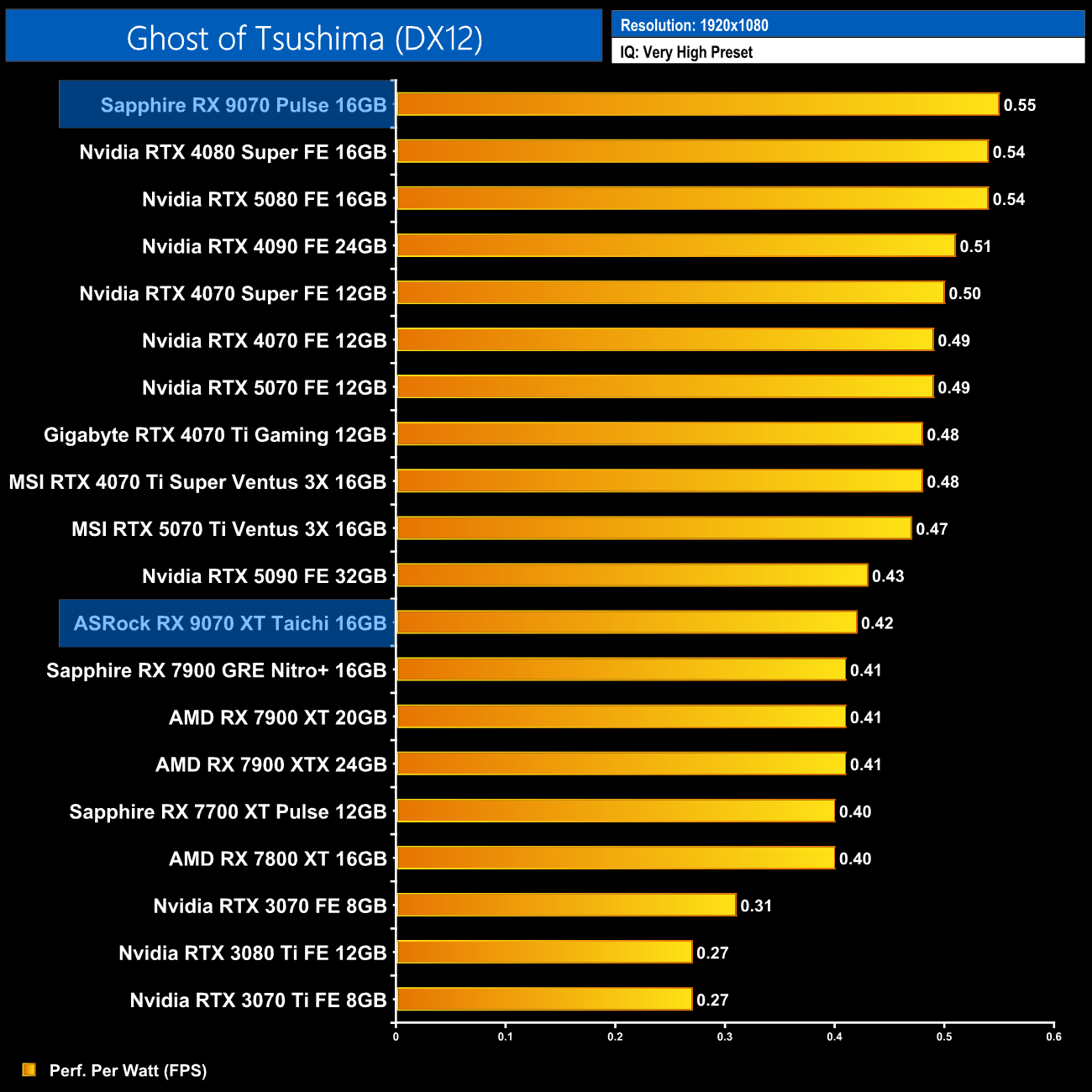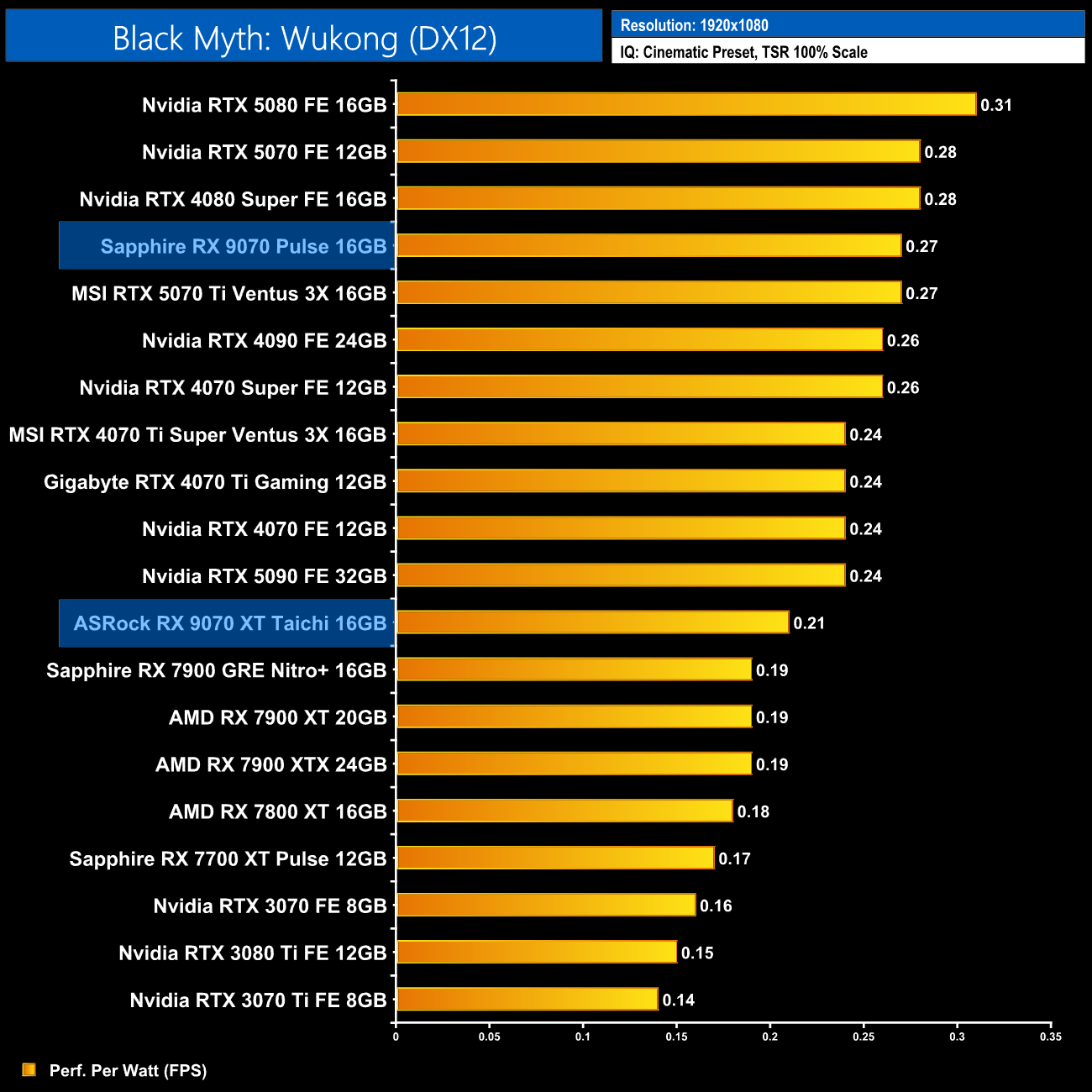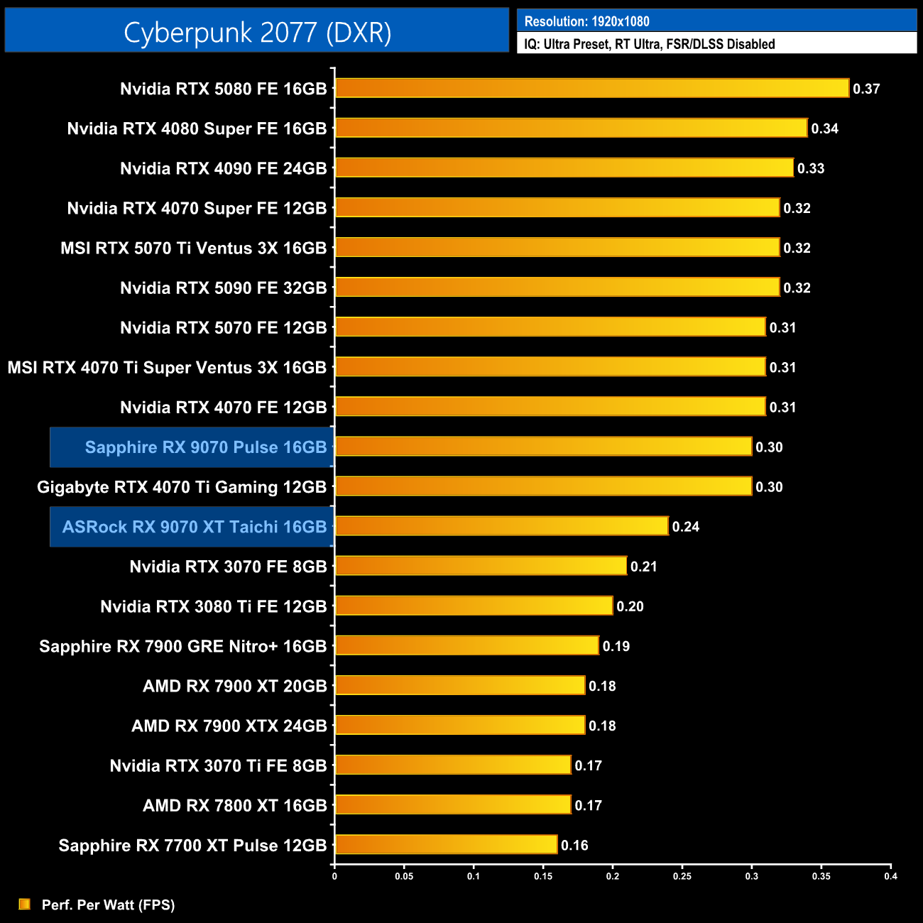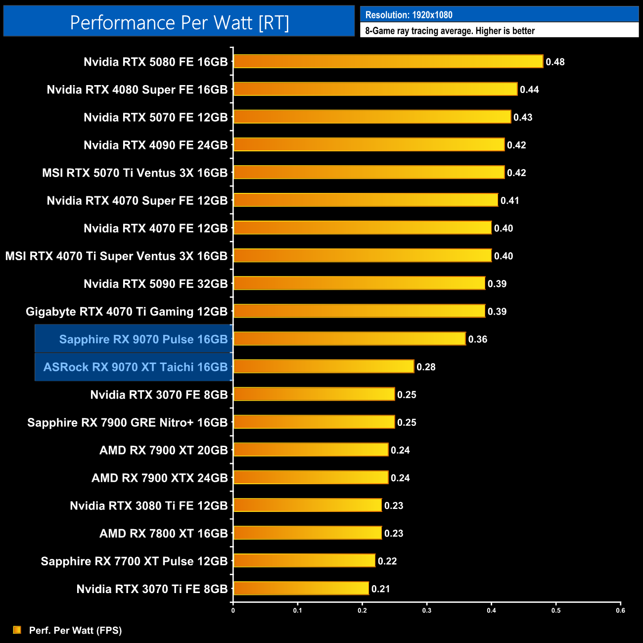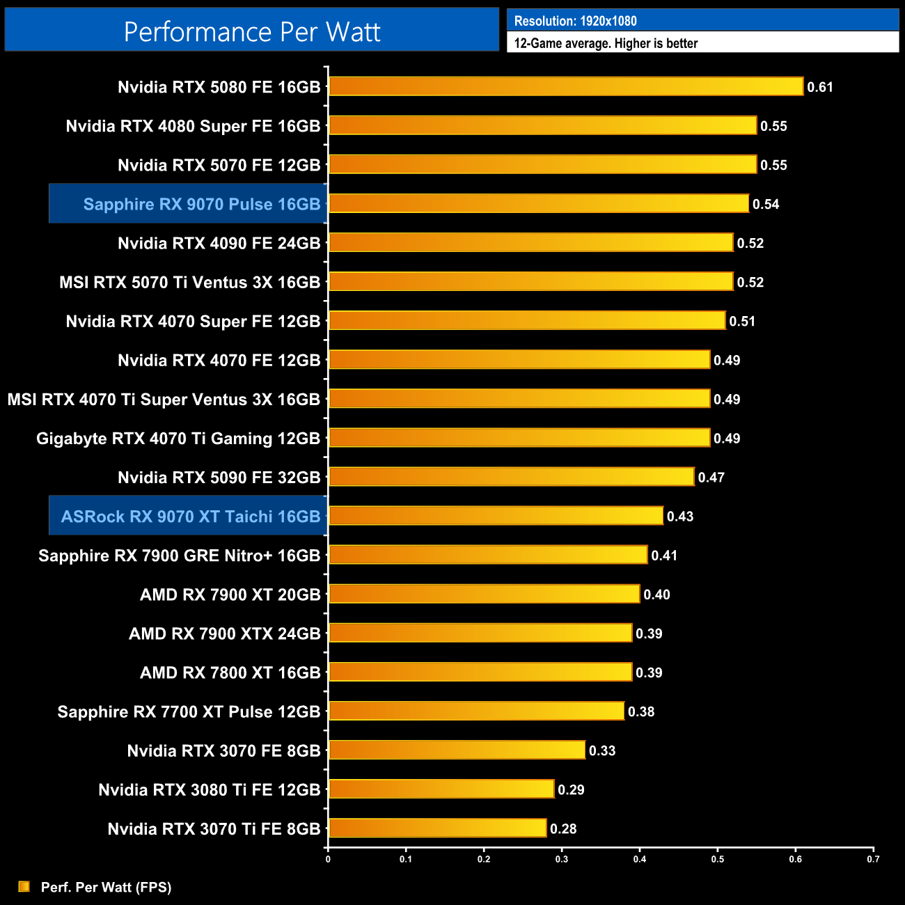 Efficiency for the ASRock 9070 XT Taichi isn't amazing – it's a small step forward compared to the 7900 GRE, but the 9070 non-XT is clearly miles more efficient.