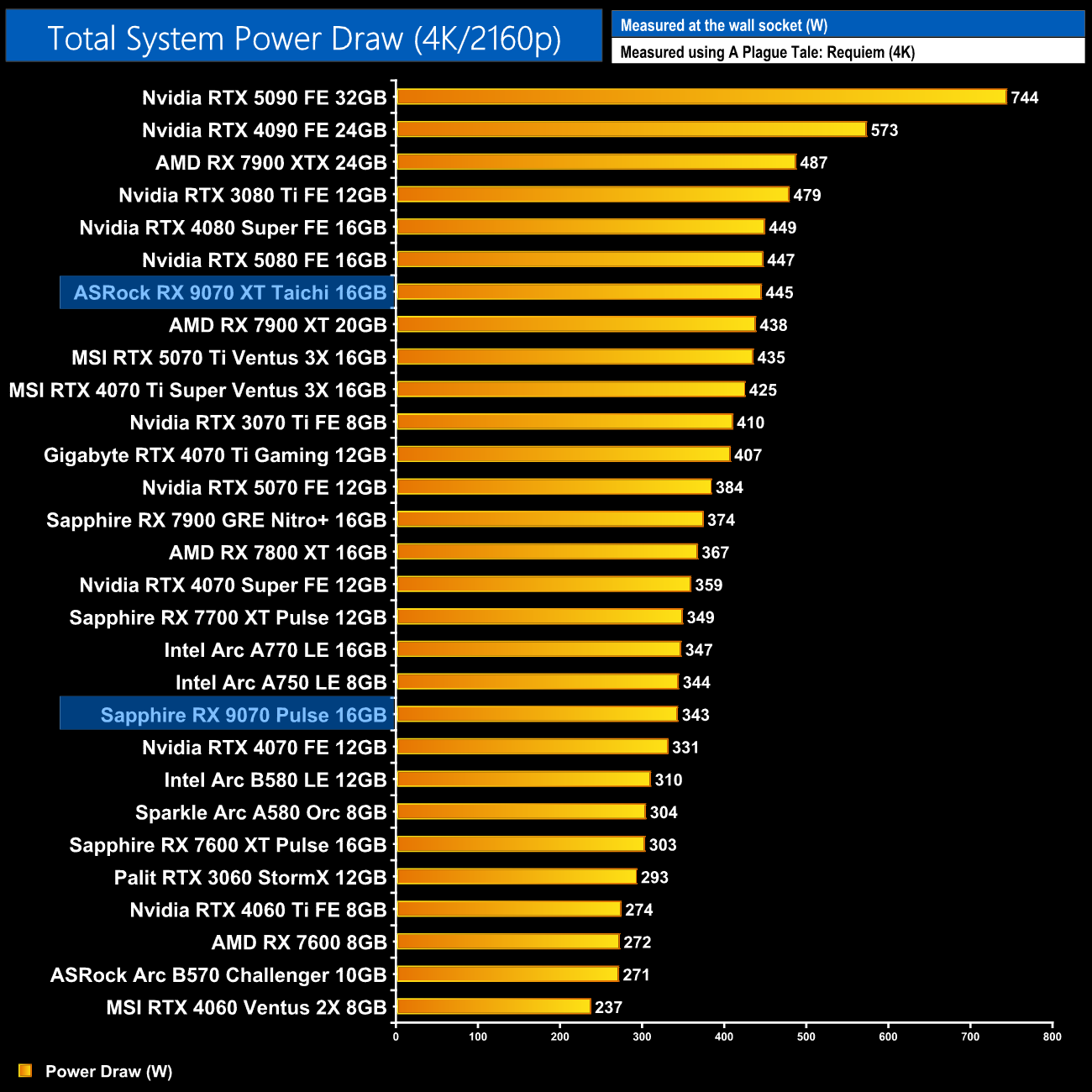 Lastly, total system power draw hit just under 450W with the ASRock Taichi, in line with the RTX 5080 and RX 7900 XT.