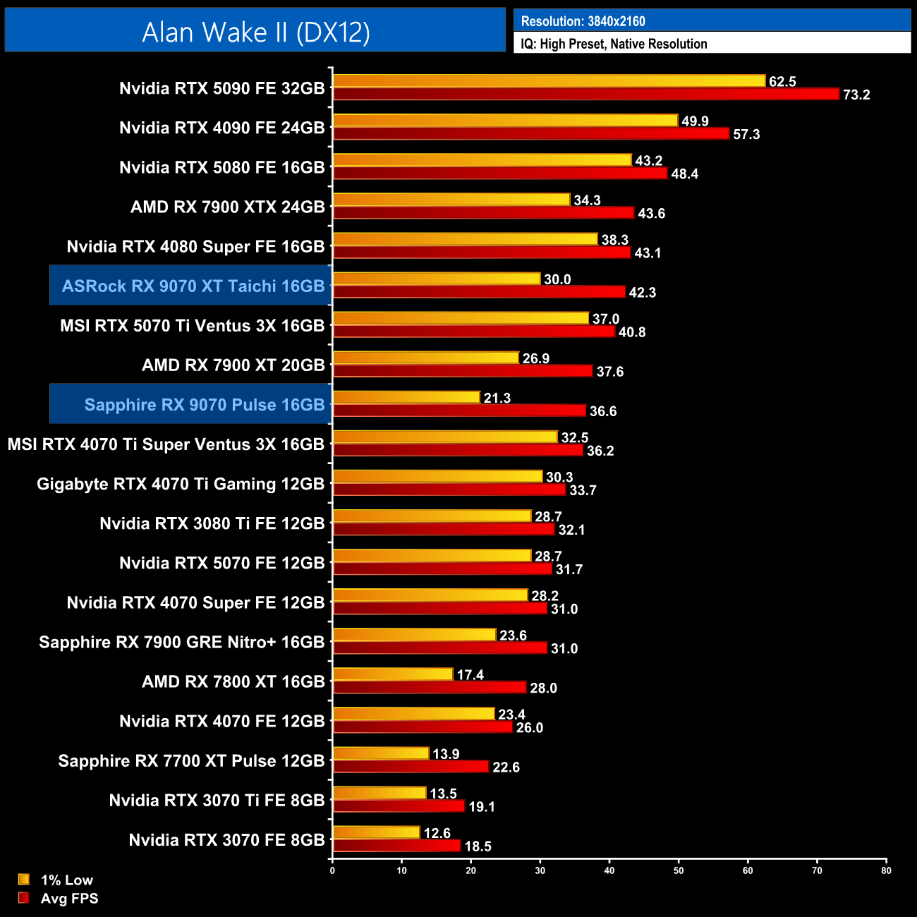 Kicking off with Alan Wake 2, it's a strong start for the RX 9070 XT given it averages 77fps, putting it level with the RTX 4080 Super, and about 6% ahead of the RTX 5070 Ti at 1440p.