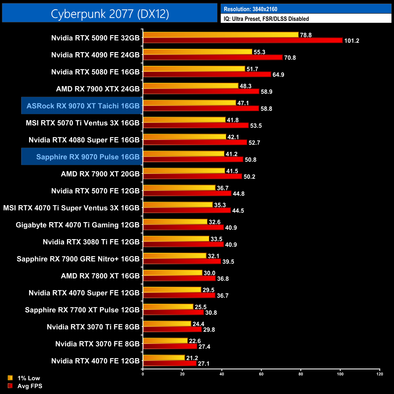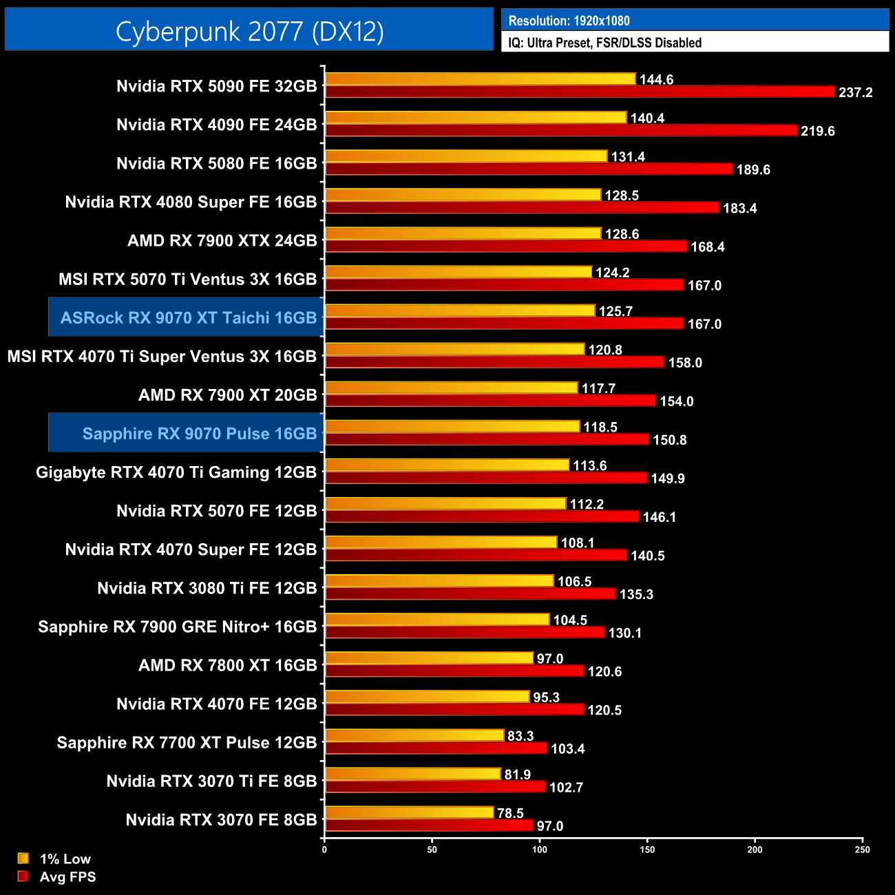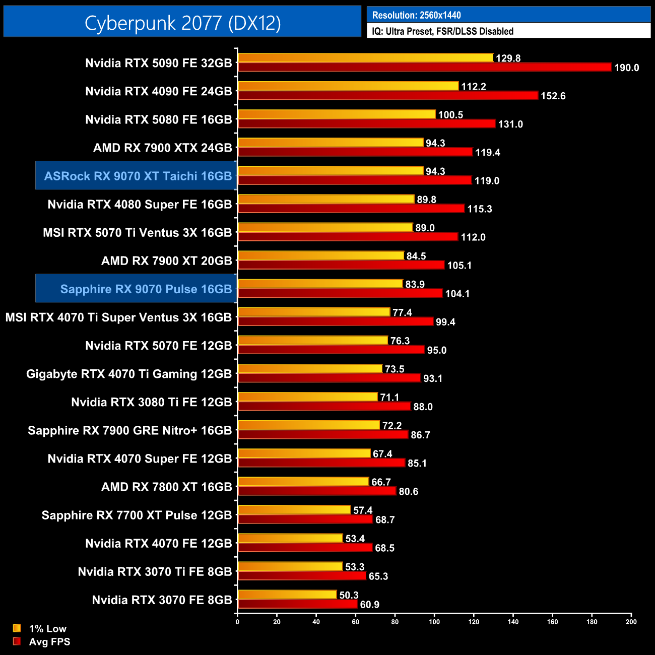 Moving onto Cyberpunk 2077, it feels quite ironic to me that the 9070 XT is actually 6% faster than the 5070 Ti at 1440p – after all, this game is Nvidia's RTX poster child, but AMD takes the lead.