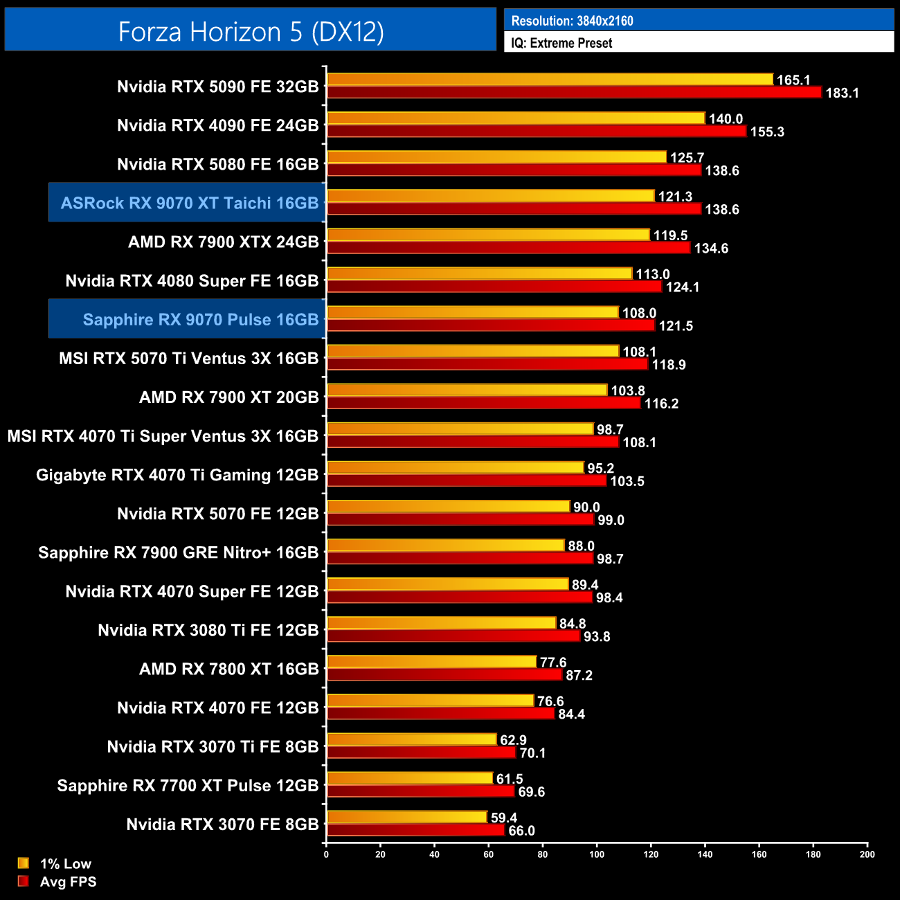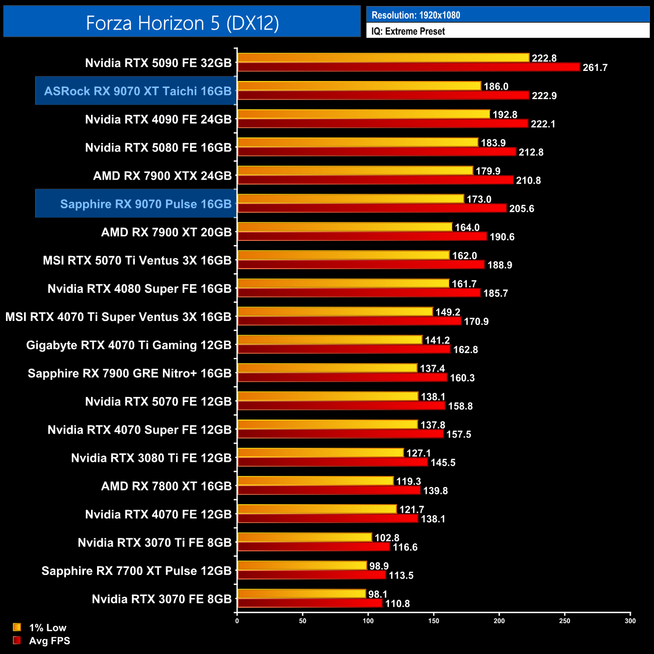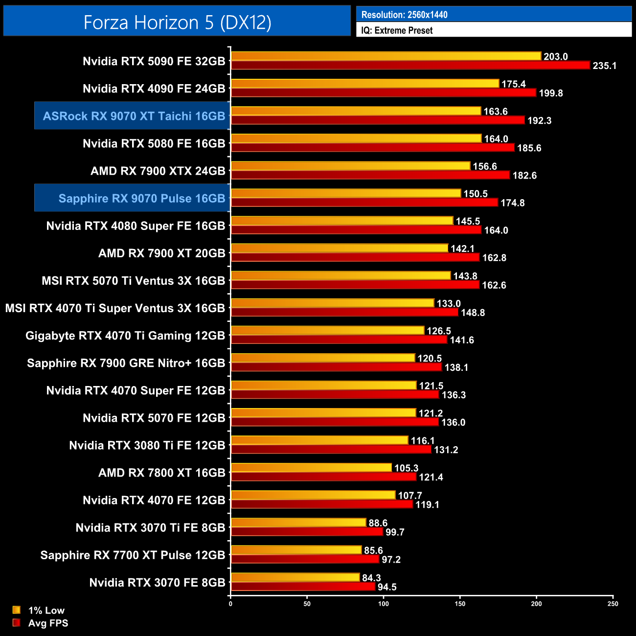 Interestingly, Forza Horizon 5 seems to massively over-perform on these new RDNA 4 GPUs. At 1440p I have the 9070 XT coming in 18% ahead of the 5070 Ti – the biggest margin we will see today – and it's even faster than the RTX 5080 which is quite staggering.