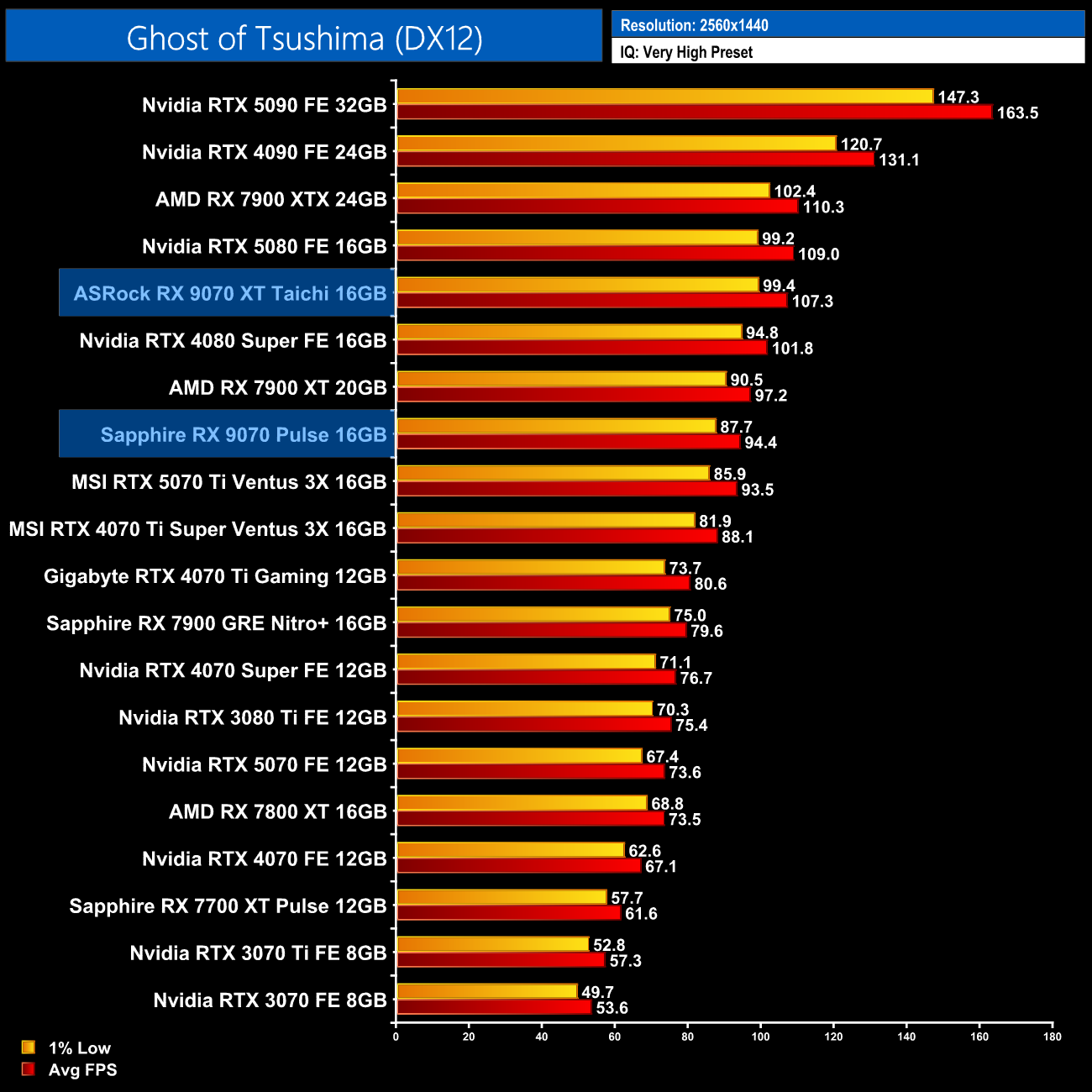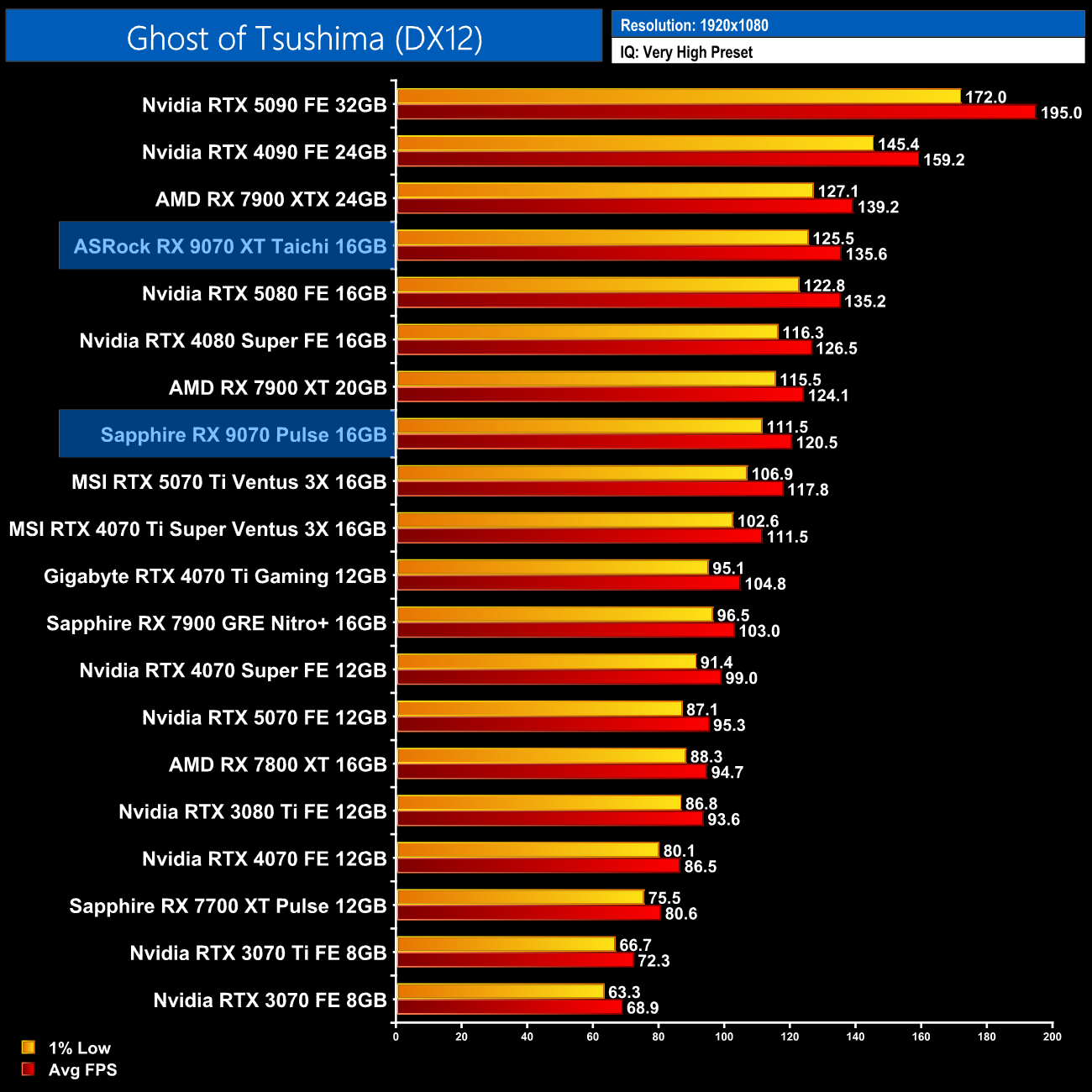 Ghost of Tsushima is the other title I test where we saw performance for RDNA 4 far outstrip expectations, given the 9070 XT is still 15% faster than the 5070 Ti.