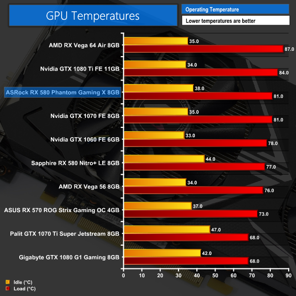 For our temperature testing, we measure the peak GPU core temperature under load, as well as the GPU temperature with the card idling on the desktop. A reading under load comes from running the 3DMark Fire Strike Ultra stress test 20 times. An idle reading comes after leaving the system on the Windows desktop for 30 minutes.