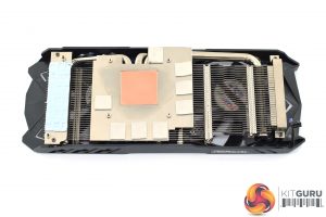 As for the cooler, this is comprised of a copper contact area surrounded by an aluminium heat sink. Two 6mm and one 8mm heatpipes are used to transfer heat to the fin array, and the fans then dissipate the heat from the fins. It is also worth noting each of the 8 memory chips have the necessary thermal pads applied, as do the MOSFETs.
