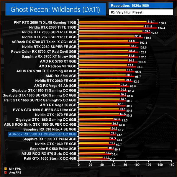 Moving onto Ghost Recon Wildlands, here things swing back in Nvidia's favour, with the 1650 SUPER proving almost 4FPS faster at 1080p.
