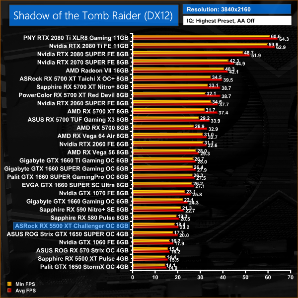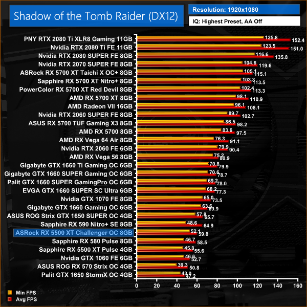 Shadow of the Tomb Raider is the last title where we see memory limitations come to the fore – in this game, the 8GB 5500 XT is 8% faster than its 4GB counterpart at 1080p.