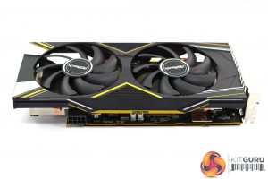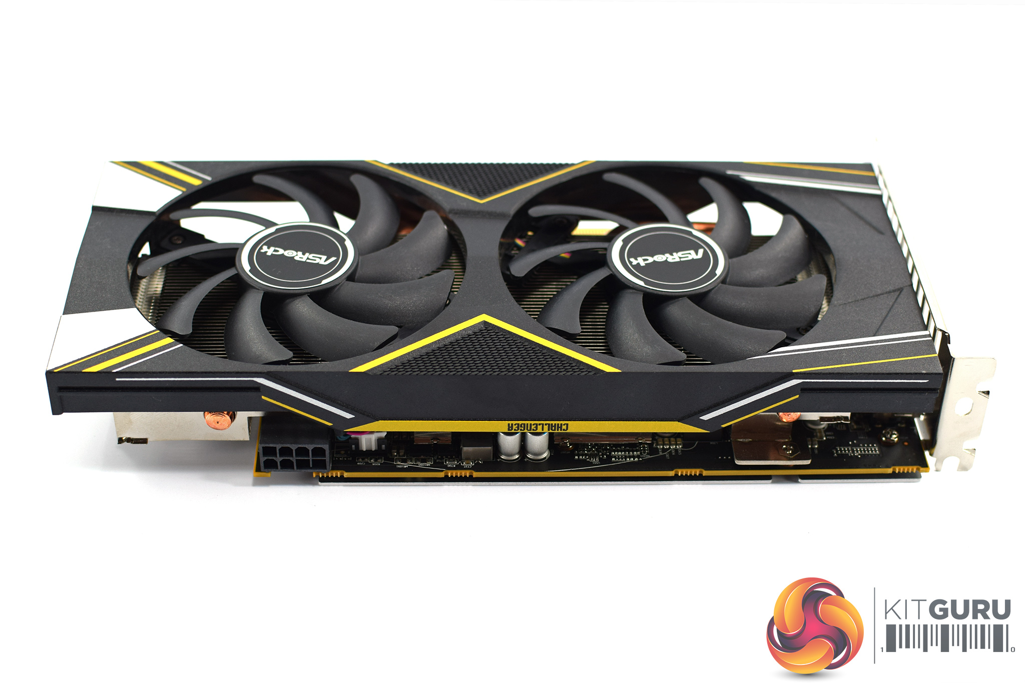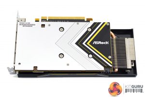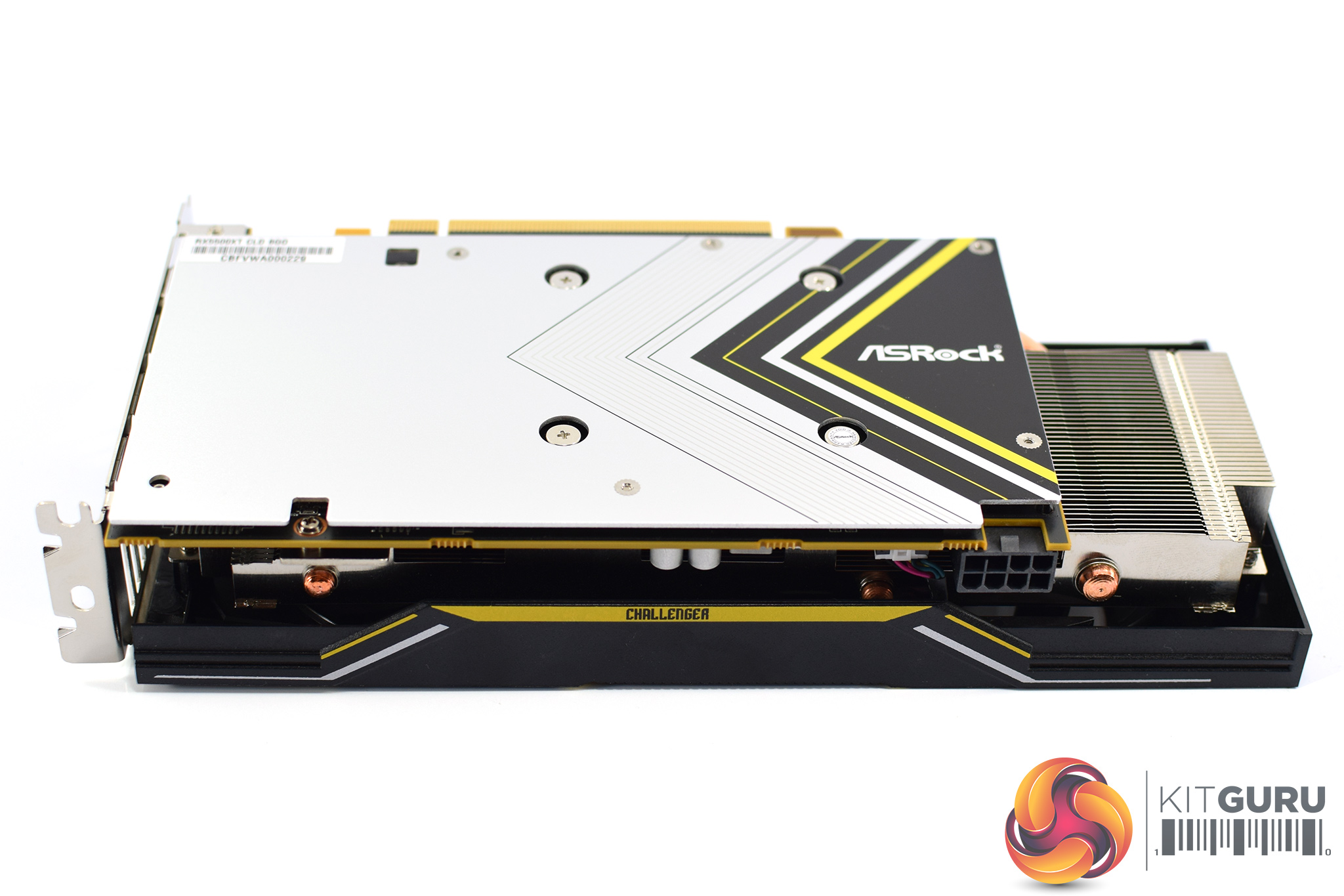 On the front side of the card, we can see a small yellow strip with ‘Challenger' written in tiny black text. We can also get a look at the metal backplate, which is mostly silver with some yellow and black sections too. This only covers the length of the PCB, so there's almost 5cm of space where the heatsink and shroud extend beyond the PCB.