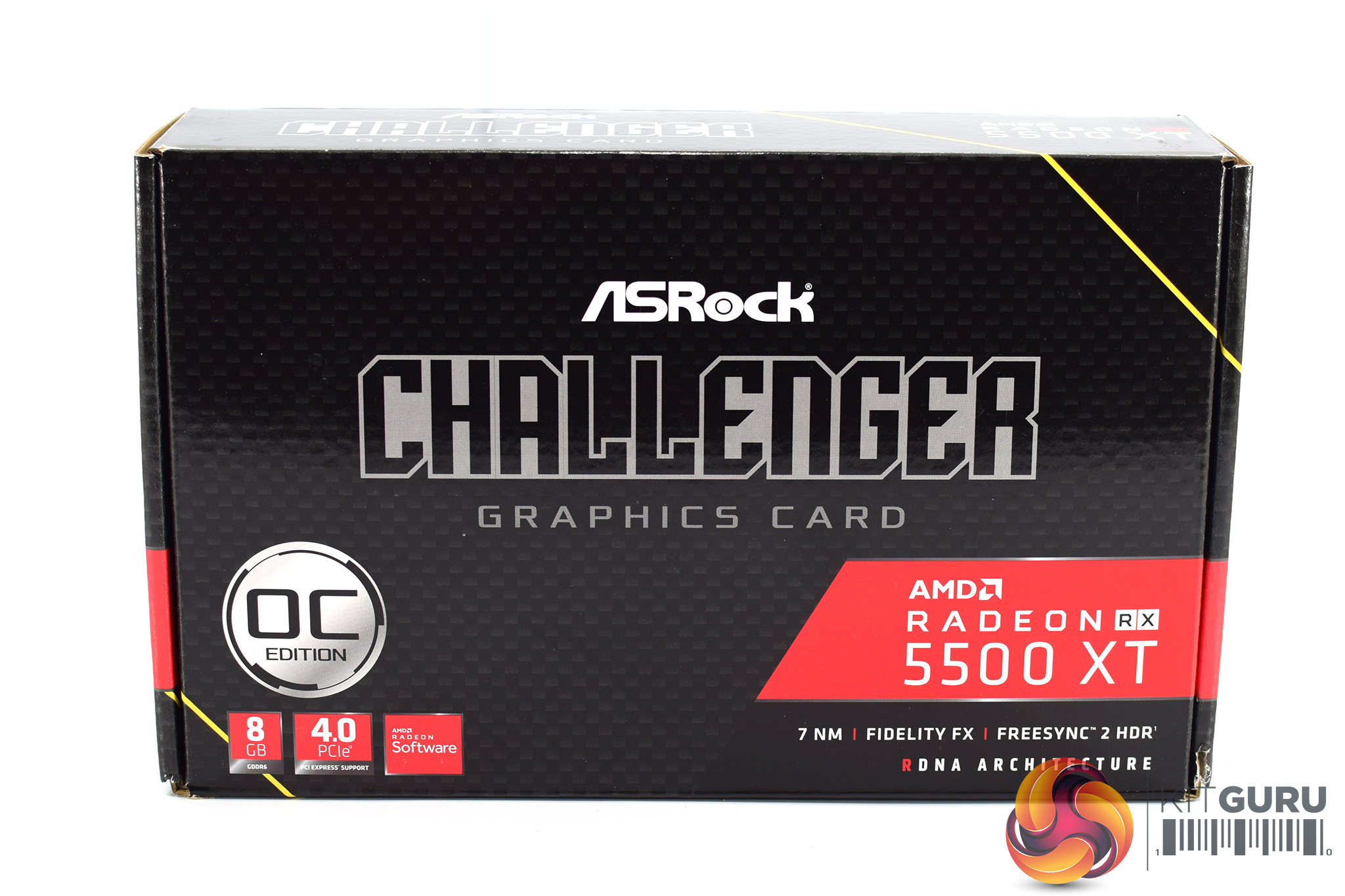 The ASRock RX 5500 XT Challenger 8GB ships in a black box, with the AMD Radeon and Challenger logos taking pride of place on the front.