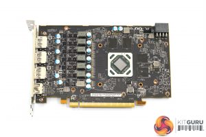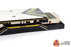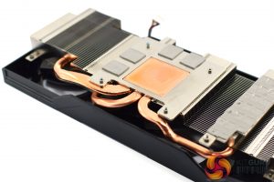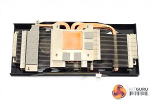 As for the heatsink, this uses a single finstack with three copper heatpipes. The GPU die contacts with a central copper plate, and this is surrounded by another plate for the VRAM. One final plate for the VRM is also off to the side.