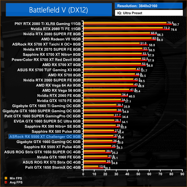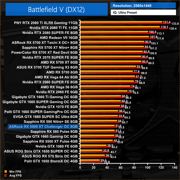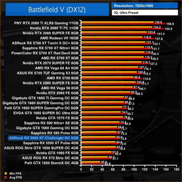 Battlefield V kicks things off, and here the 5500 XT is averaging over 70FPS at 1080p. The ASRock Challenger holds a 3% performance advantage over GTX 1650 SUPER.