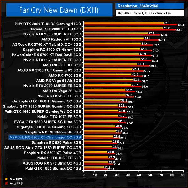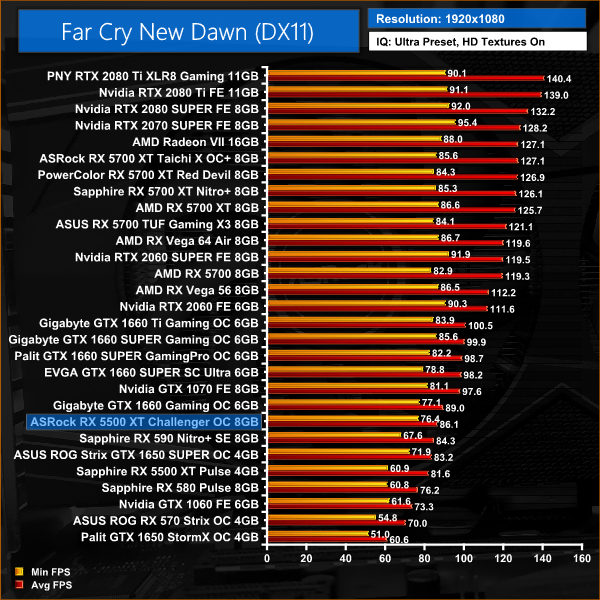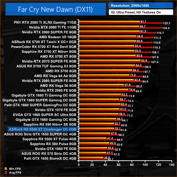 The 8GB 5500 XT sits much closer to GTX 1660 in Far Cry New Dawn, and it holds a 6% performance advantage over the 4GB 5500 XT we've also tested today. This is one of the few games we tested where it seems 4GB VRAM is a limiting factor at 1080p.