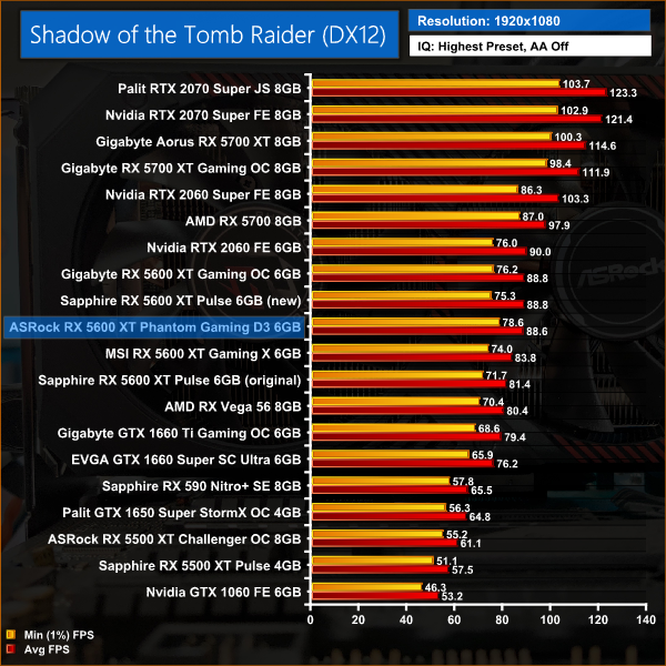 While Red Dead Redemption 2 may be a strong game for AMD, Shadow of the Tomb Raider swings the opposite way, though the margins are not as large – the ASRock Phantom Gaming is 2% slower at 1080p, and 3% slower at 1440p.