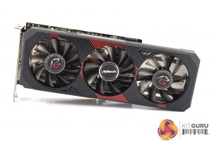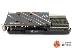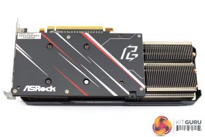 As for the graphics card itself, this is the first Phantom Gaming card we have seen from ASRock and, just like the motherboards, there is a red and black colour scheme used here – the shroud is mostly black plastic, but you can see some red stripes above and below the fans. There are also two brushed metal plates screwed onto the plastic at either end of the card.