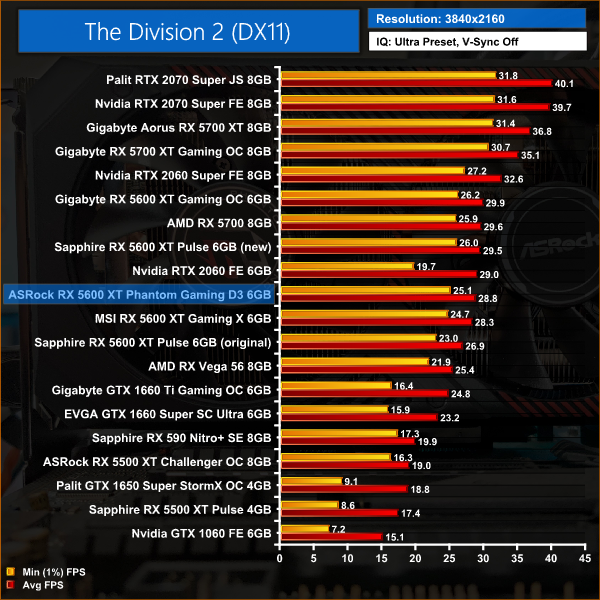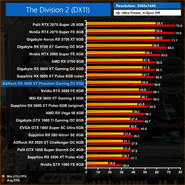 Next up is The Division 2, and at 1080p the Phantom Gaming 3 holds a 4% lead over the RTX 2060. There is, however, a 2% gap between the Phantom Gaming and the Sapphire Pulse, but that works out as just a 1.4FPS difference.