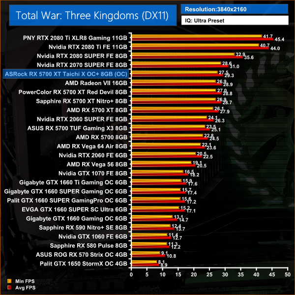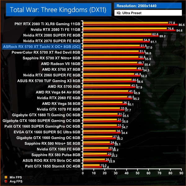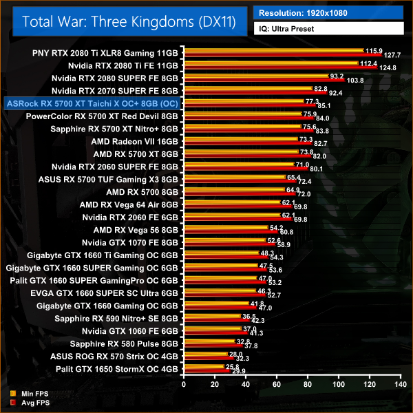 Total War: Three Kingdoms rounds off our game testing for today, and we can see another 5% performance uplift for the Taichi versus the reference RX 5700 XT. That means the Taichi is 2% ahead of the Red Devil and Nitro+.