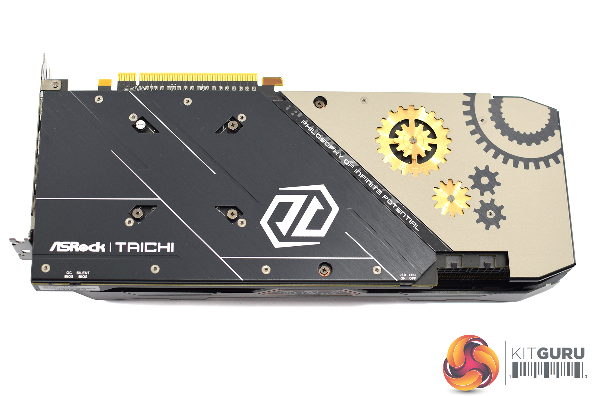 On the front side of the card, there are three things worth mentioning. The first is the dual-BIOS switch, which sits on the left-hand edge of the card. By default, the switch is positioned to use the ‘OC BIOS', but you can engage the ‘Silent BIOS' if you prefer. Secondly, we can also see the Taichi logo, with more cog and gear styling, positioned in the middle of the card – this is another RGB zone. Lastly, if you don't want any RGB lighting, there is a second switch on the side of the card, which will turn the LEDs on or off – this acts as a master switch.