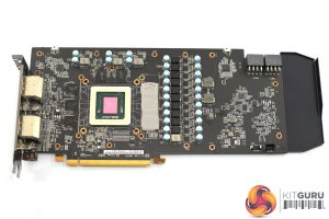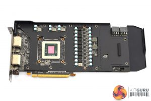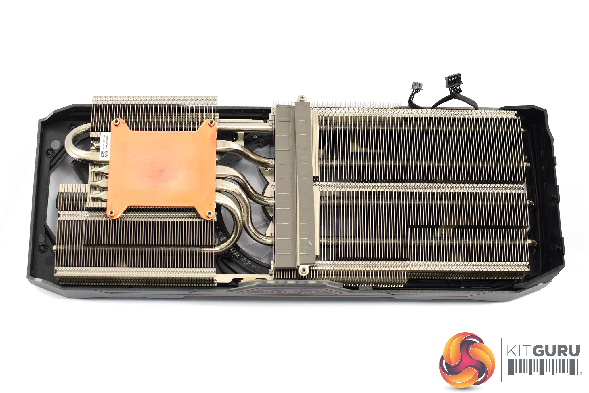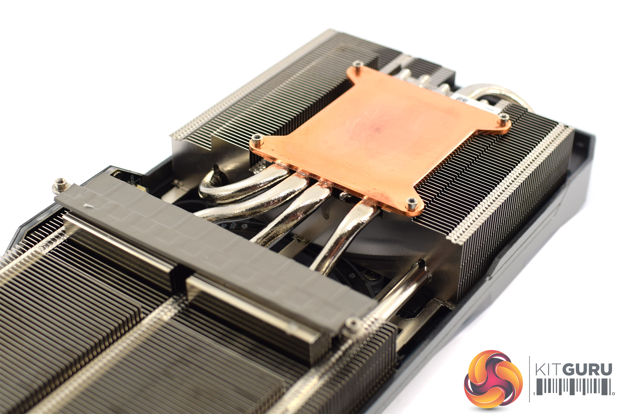 Looking now at the heatsink, this is comprised of two separate fin stacks, connected by a total of five, 6mm heatpipes. The GPU itself contacts with a copper plate which sits above the heatpipes, while there is a separate plate for the VRM circuitry as well. The memory is cooled by the black plate shown above.