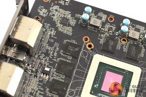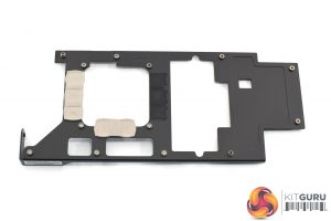 Once we remove the heatsink from the card, we can get a look at the PCB, though most of it is obscured by a large metal frame that acts as a secondary heatsink for the memory chips.