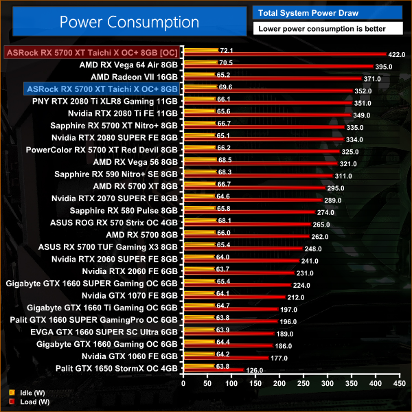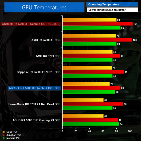 The card did not handle this overclock well. In terms of temperatures, GPU edge temperature rose by 10C, GPU junction temperature rose by 18C, and memory temperature also rose by 8C. This meant the fans spun up to 2130rpm, resulting in noise levels rising by 1.5dB. Lastly, power draw also increased to frankly ludicrous levels, with the system pulling over 420W at the wall. Considering we gained just 4-6% performance from this overclock, I really don't think it is worth the increased noise, power and temperatures.