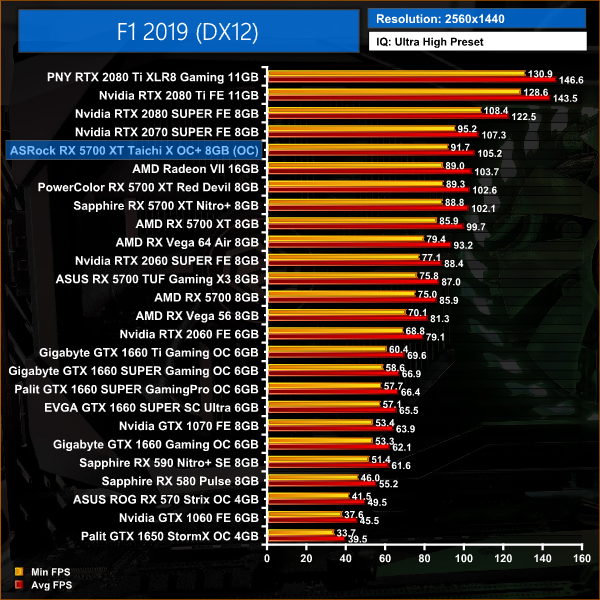 F1 2019 is another title where we see decent gains with the Taichi X versus the reference card, with a 6% performance difference at 1440p. At the same resolution, the Taichi outperforms the Nitro+ by 3%.