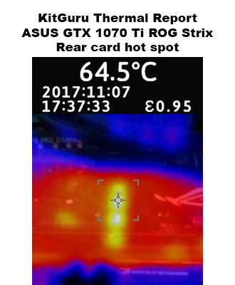 Moving onto our thermal imaging, the hottest point on the back of the card peaked at 64.5C – there are actually some exposed transistors on the back of the card which is where the heat is coming from.