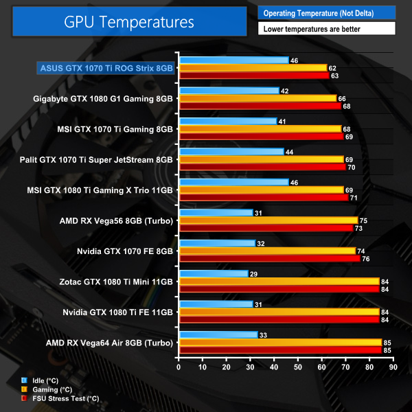 Here the Strix cooler shows itself to be a class-leading design. Despite testing in OC mode (+76MHz to the GPU core), the Strix GTX 1070 Ti still posted the lowest temperatures I have seen to date.