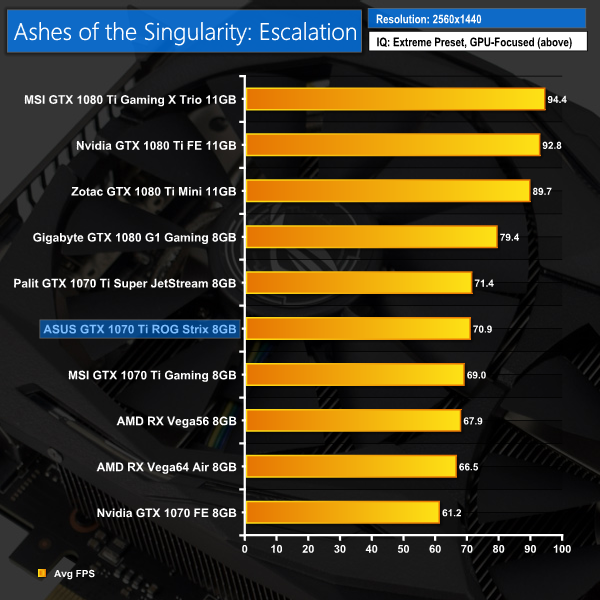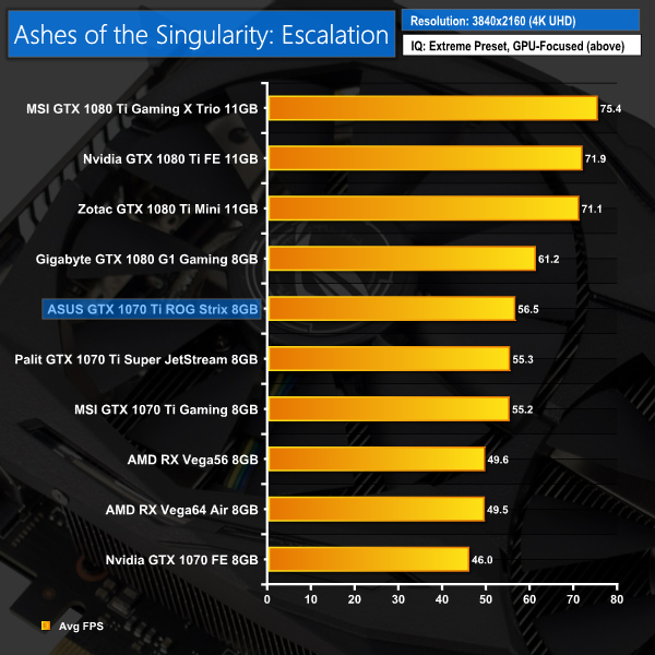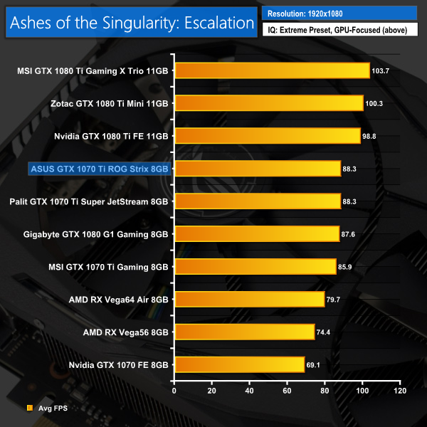 Ashes isn't quite as cut-and-dry as our initial 3DMark benchmarks – at 1080p both the Strix and Palit cards scored exactly 88.3 FPS, while the Palit edged ahead at 1440p. At 4K, however, the Strix card reclaimed the lead.
