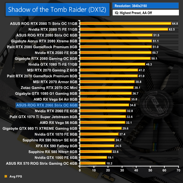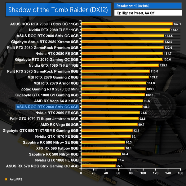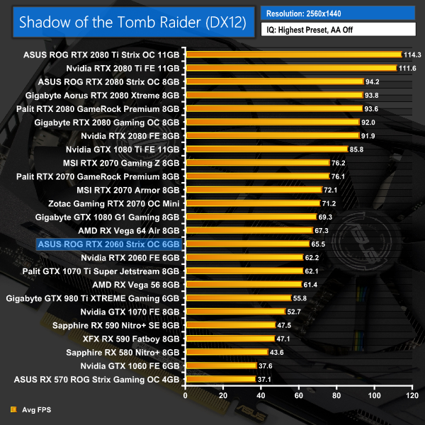 Our last traditional game of the day, Shadow of the Tomb Raider again shows the Strix 2060 to have a considerable lead over the Nvidia Founders model. At 1080p, for instance, the Strix is 4.4FPS faster, while the gap between the two is 3.3FPS at 1440p.