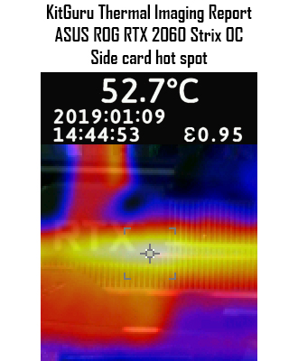 The low temperatures continue when we look at the card with our thermal imaging camera. Here, the hottest spot on the card itself didn't even reach 54C, which only goes to show how well the Strix cooler is able to disperse the heat produced by the card.