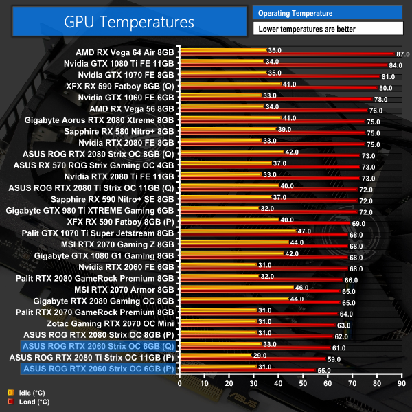 I was always expecting thermal performance from the Strix 2060 to be good – but not this good. With the performance BIOS, the card didn't run hotter than 55C under load which is simply fantastic. Even when using the quiet BIOS, which runs the fans significantly slower, the temperature topped out at 61C. That just goes to show, if you stick a big cooler with a triple fan setup on a RTX 2060, you are going to get very impressive thermal results.