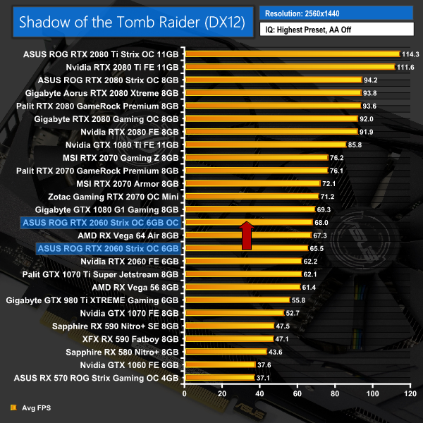 Given this card is already running very fast out of the box, it is not a huge surprise that manual overclocking headroom is limited. That means we didn't see much performance benefit from the extra frequency, with an extra 2.5FPS in Shadow of the Tomb Raider being about as good as it got.
