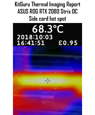 Still, moving onto the thermal gun testing, the images above show the card when running the performance BIOS. The side of the card peaked at 68C, and that was an area of the aluminium fin stack.