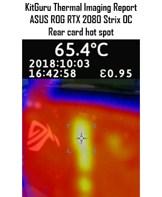 The rear of the card peaked at 65.4C, which is another top result – this was an area of the PCB that was left exposed. The rest of the backplate is visibly cooler on the image above. In any case, both results are excellent and are nowhere near the thermal limits of the components.