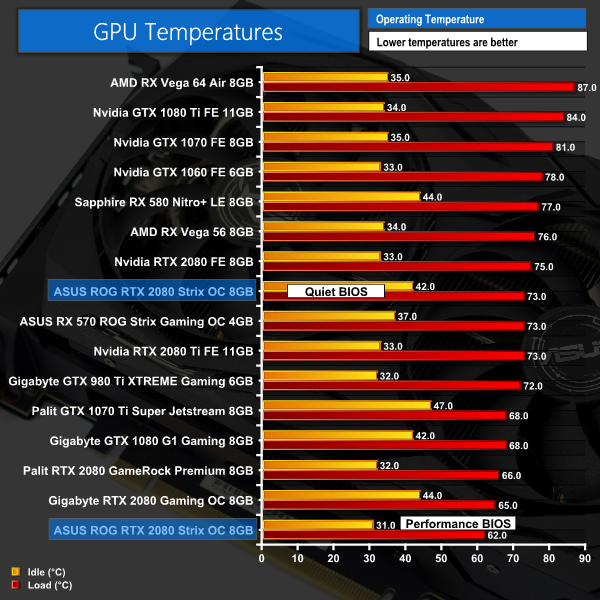This is where things get very interesting. Starting with the performance BIOS, a peak of 62C on the GPU core is fantastic – it's 3C cooler than the next-best aftermarket RTX 2080, and a huge 13C cooler than the Founders Edition.