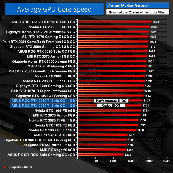 Getting a look at average clock speed out of the box, we can clearly see the the Strix holds an advantage over the Founders Edition 2080 Ti – with the performance BIOS, it is about 120MHz faster and that only drops to 90MHz when we switch to the quiet BIOS.