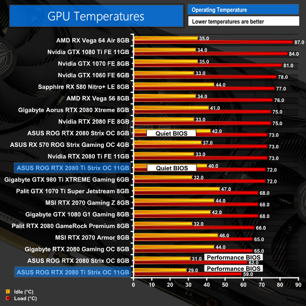 If you thought the thermal performance of the Strix 2080 was good, the Strix 2080 Ti is even better. Using the performance BIOS, it peaked at just 59C on the GPU core, which is simply fantastic. It did run little louder in this mode, but more on that on the next page.