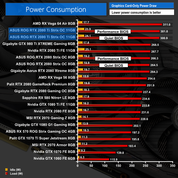 The Strix 2080 Ti is certainly a power-hungry card – neither BIOS makes much difference, with both drawing just over 300W. This means it only draws 10-11W less than a Vega64, although performance is significantly better than the Vega64 as well which is worth remembering when looking at the power figures. In any case, I doubt very much that an extra few pounds a month on the electricity bill is going to bother anyone that would spend £1500 on a graphics card in the first place.