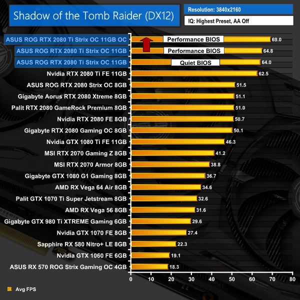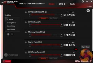 When overclocking the Strix 2080 Ti, we used GPU Tweak II with the performance BIOS engaged. We maximised the the voltage, power limit and temperature target sliders before adding +145MHz to the GPU core and +700MHz to the memory. It’s worth noting that the ‘+145MHz’ is relative to the out of the box clock speed (1650MHz), so considering we tested the card at 1665MHz, we really added an extra +130MHz to that.