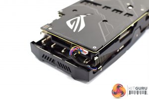 ASUS has stuck with its lovely brushed metal backplate, too, and I really quite like the look of it, though be careful not to touch it as it is really quite hard to clean fingerprints off! The ROG logo on the back is RGB illuminated as you would expect, though as with the Strix 2080, there is a master power button for the RGB lighting just above the NVLink connector – push this, and all the RGB will turn off. Simple.