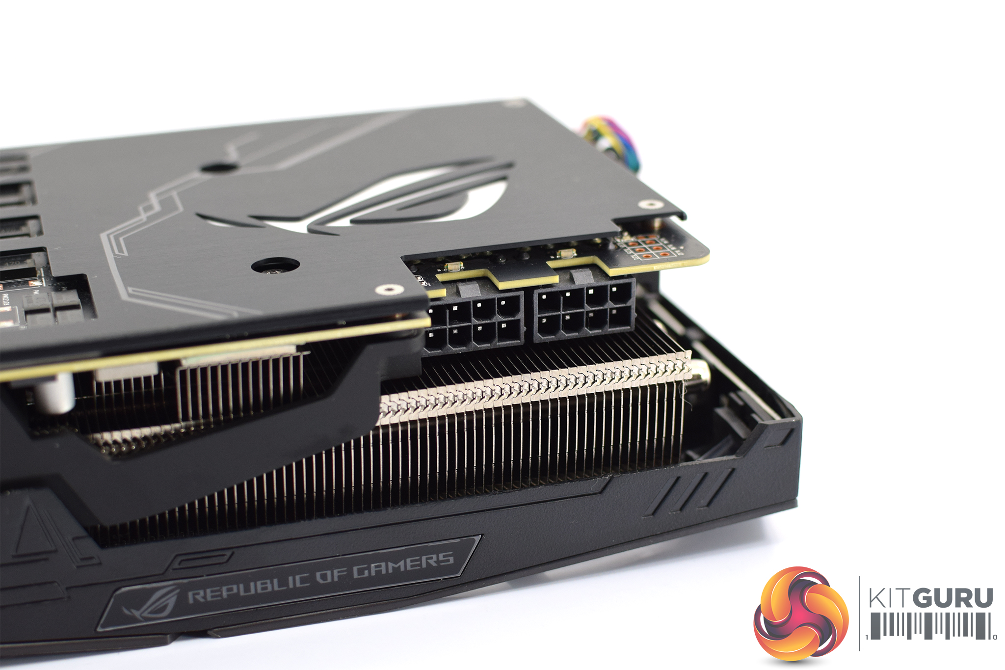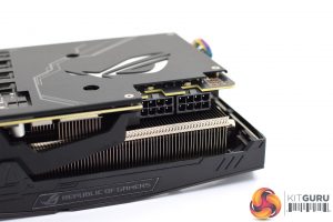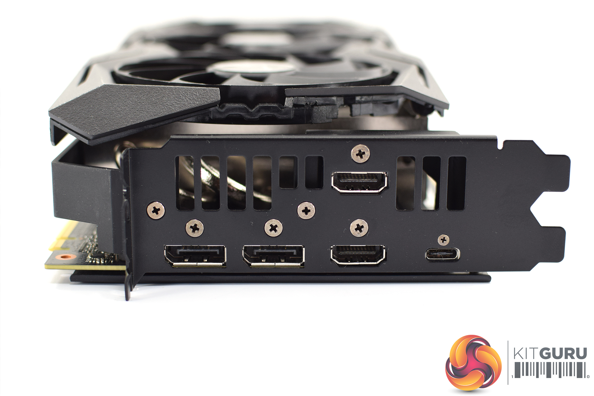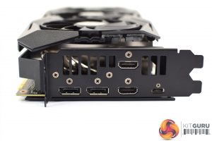 One of the last things to mention are the 2x 8-pin PCIe power connectors that are required to power this card, and we can also see that ASUS has tweaked the display outputs over reference, with 2x HDMI 2.0b ports, 2x DisplayPort 1.4 and the USB-C connector present.